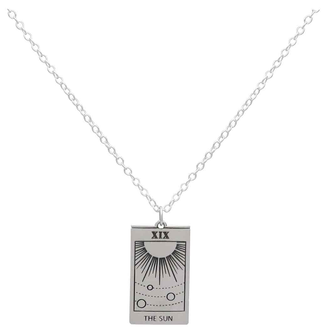 This sterling silver 18 inch sun tarot card necklace evokes feelings of optimism and fulfillment. The sun card represents the dawn that follows the darkest of nights. The sun is the source of all life on our planet, and is life energy itself. The sun card signifies abundance, radiance, vitality, success and happiness. It is one of the few cards in tarot that represents nothing but good feelings & fulfillment. Sunlight is illuminating your life's path to abundance & goals reached.