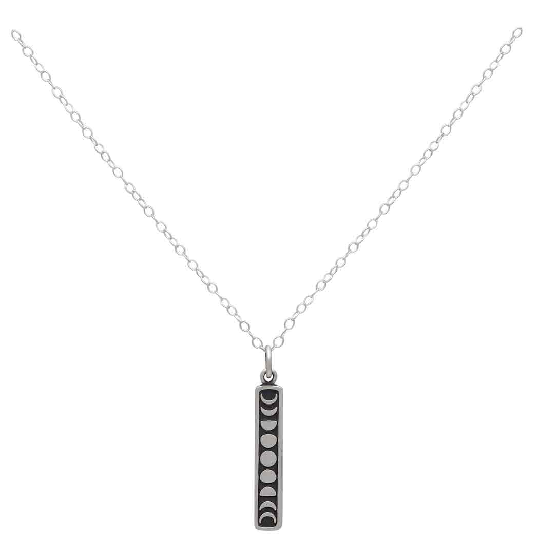 Expand your line of celestial jewelry with this sterling silver 18 inch vertical moon phase necklace. Etched and oxidized, this celestial necklace depicts all phases of the moon as it waxes and wanes, from new moon to full moon. Each lunar phase is associated with its own unique meaning: new moons stand for fresh beginnings, while the waning moon is a good time to clear negative influences.