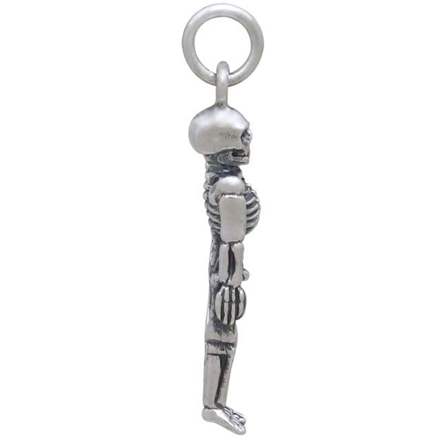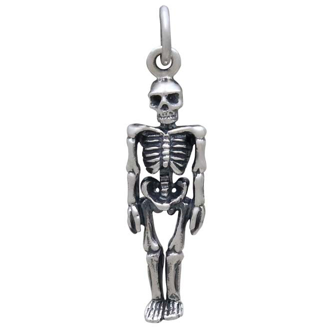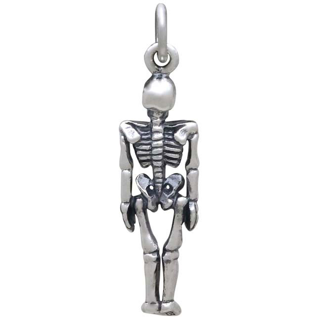 This sterling silver 3D skeleton charm is designed on all sides, and the details are incredible. Your customers will have fun flaunting their mischievous streak with this playfully morbid skeleton charm. This skeleton charm is just the thing for making fun jewelry for Dia de los Muertos and Halloween. Dangle on earrings, or use en masse on a fringe necklace!