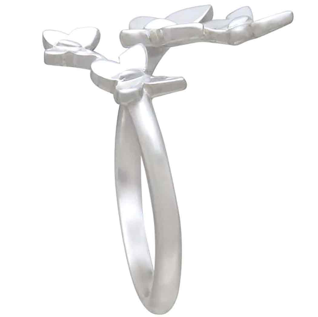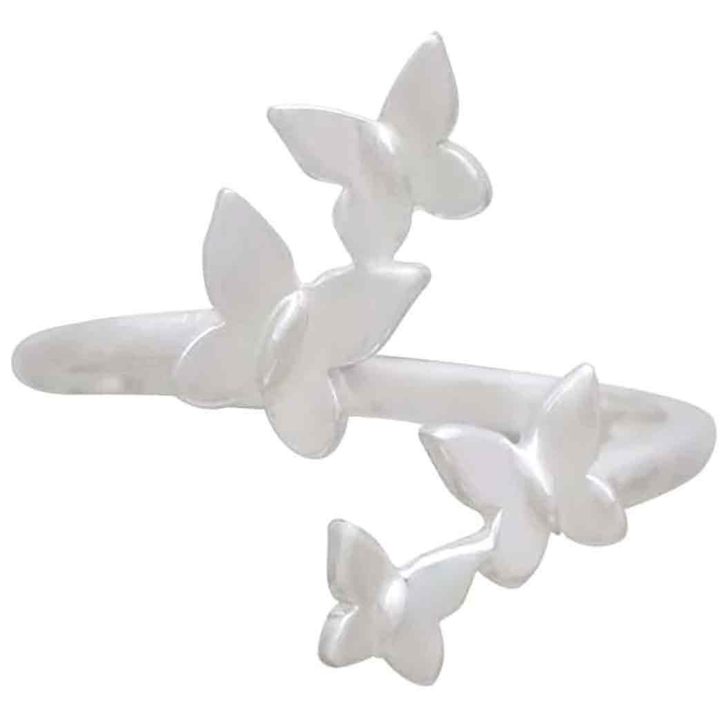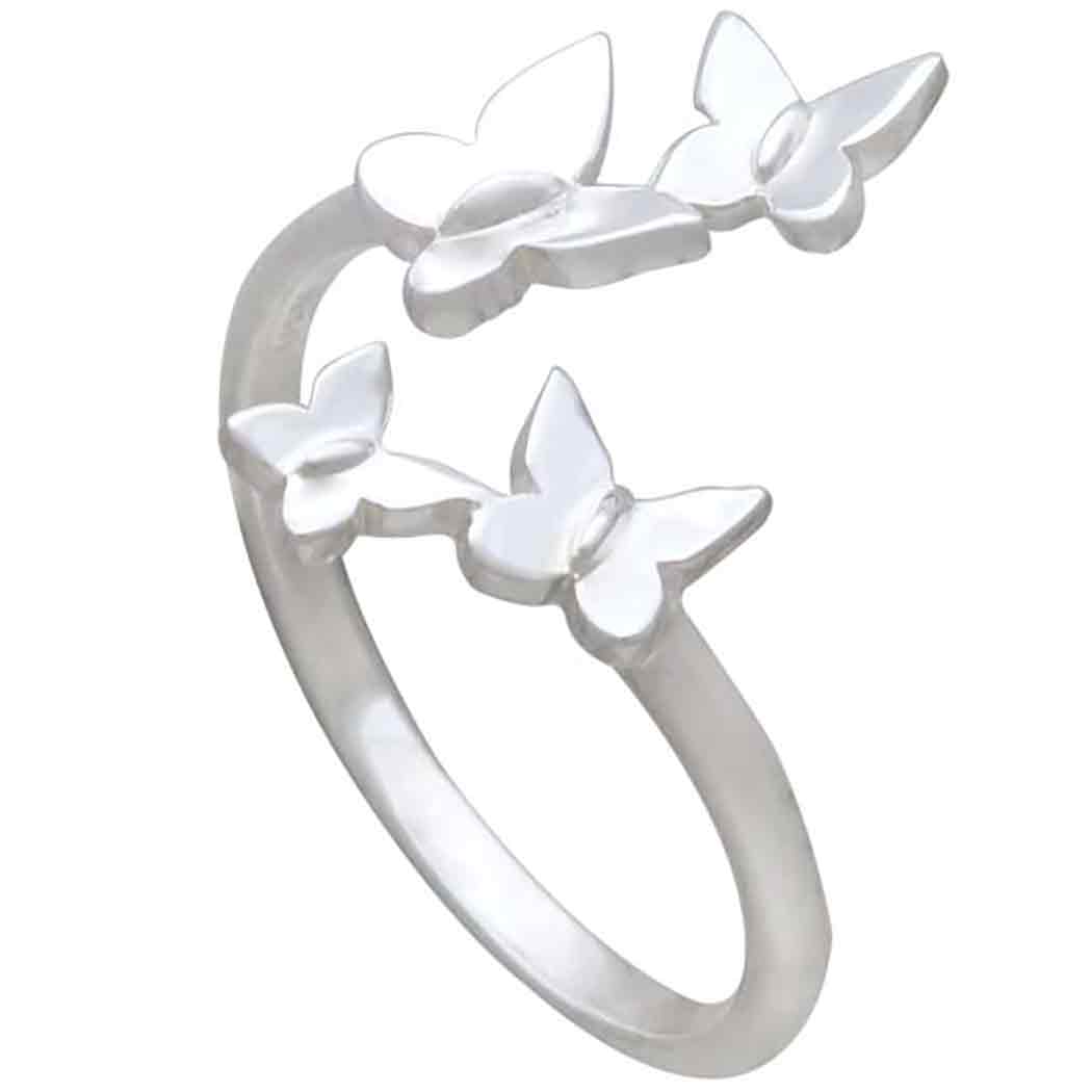 This sterling silver adjustable butterfly cluster ring is three-dimensional, featuring graceful wings in mid-flight. Butterflies symbolize transformation, rebirth, and cycles. Butterflies remind us that letting go of one part of ourselves to make room for the next is beautiful and freeing. This cycle is ongoing on many levels. From dying cells being reborn each day to the rites of passage we go through in life (puberty, education, jobs, love, parenthood, illnesses, aging, death), butterflies teach us this infinite cycle is natural, and necessary.