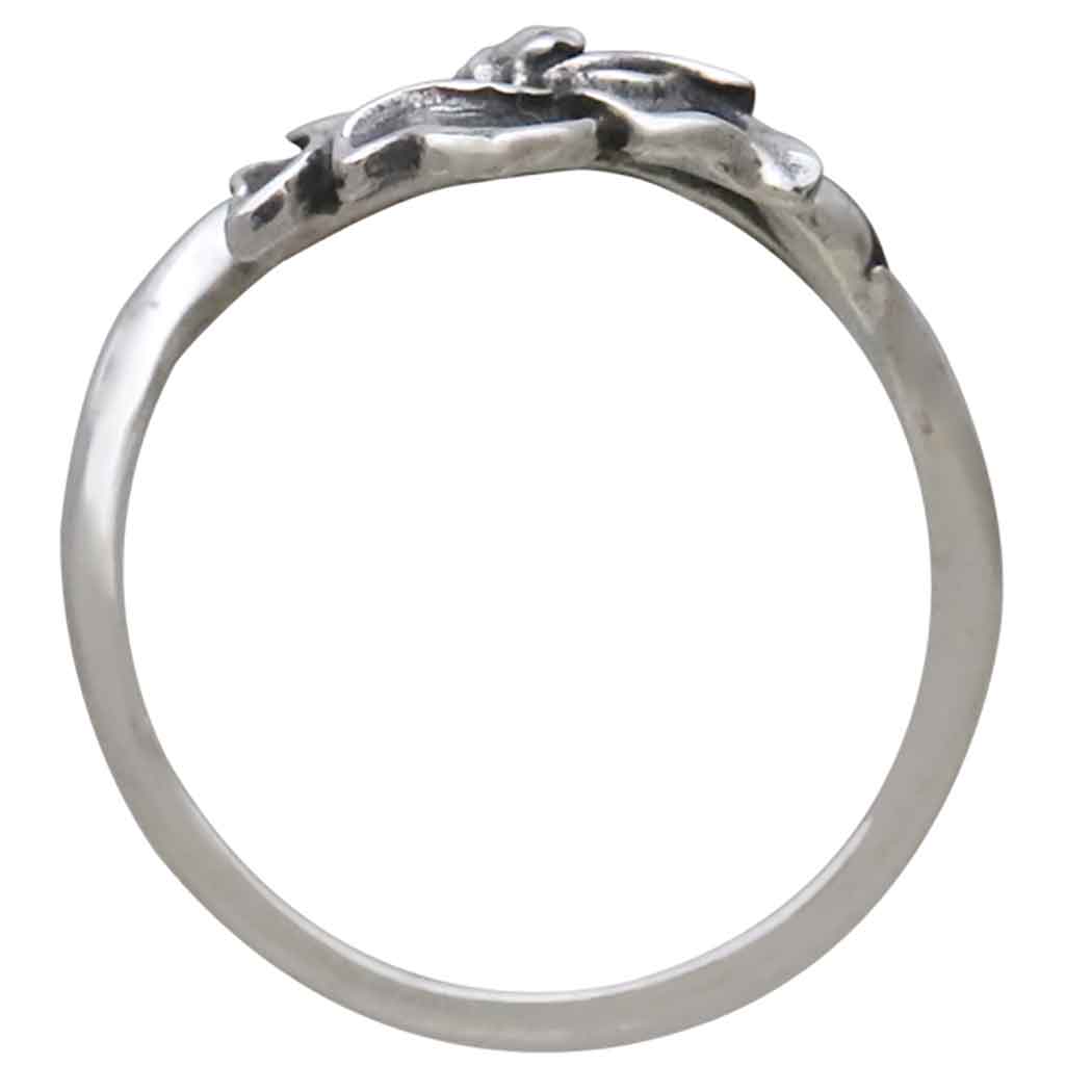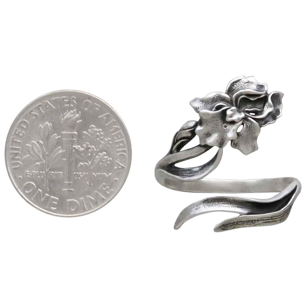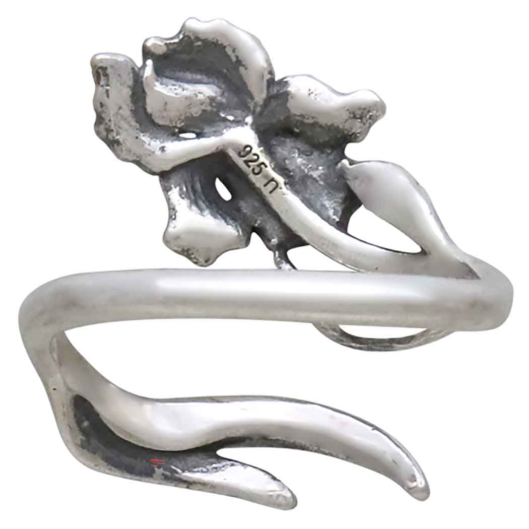 Celebrate February babies with sterling silver adjustable iris ring - February's Birthflower. This adjustable ring features a strikingly detailed iris bloom, paired with gracefully flowing leaves that wrap delicately around your finger. The oxidized finish accentuates the texture of the petals and leaves, bringing the floral design to life. Irises are in full bloom early in the year all over the world. These hardy flowers spread and grow with little care, and so symbolize trust, wisdom, and deep faith. Bold and courageous, those born in February easily trust and have faith in others.