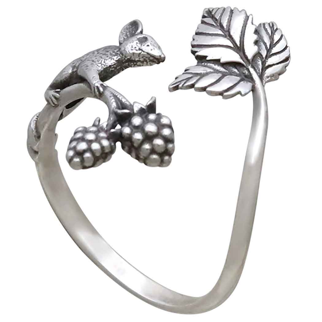 Delight in the charm of nature with this enchanting sterling silver adjustable ring. Featuring a lifelike mouse perched delicately on a curved branch, surrounded by ripe blackberries and accented with a detailed leaf that curves gracefully around your finger. The intricate textures bring the mouse’s fur, the plump berries, and the veins of the leaf to life, making it a miniature work of art.