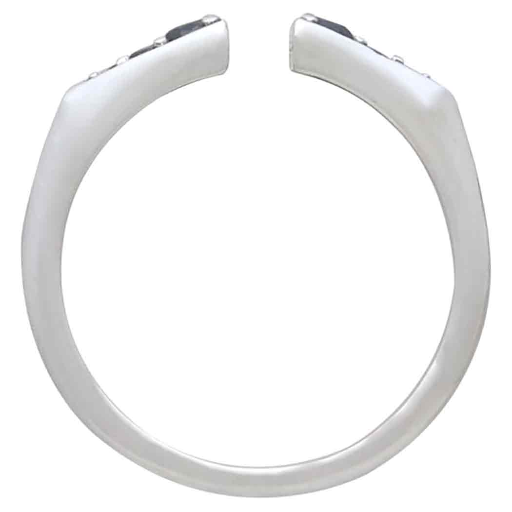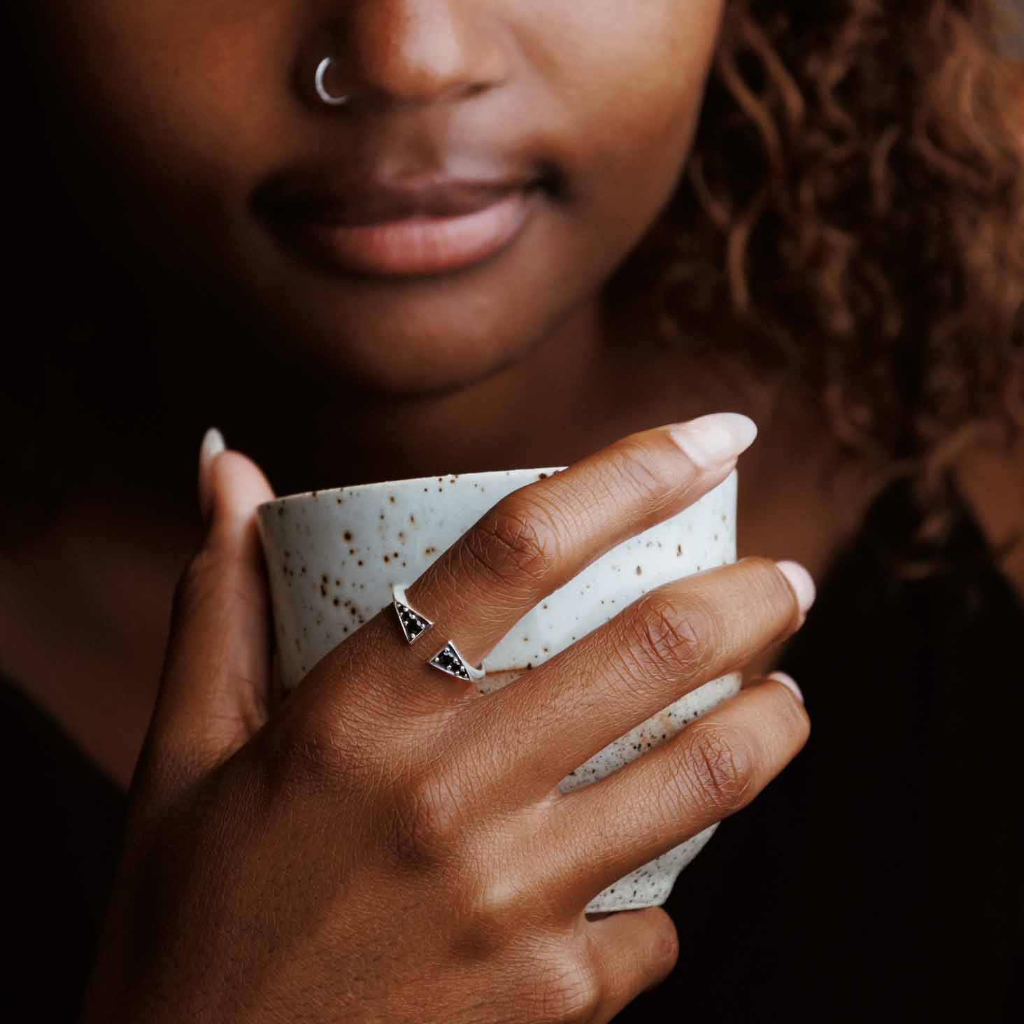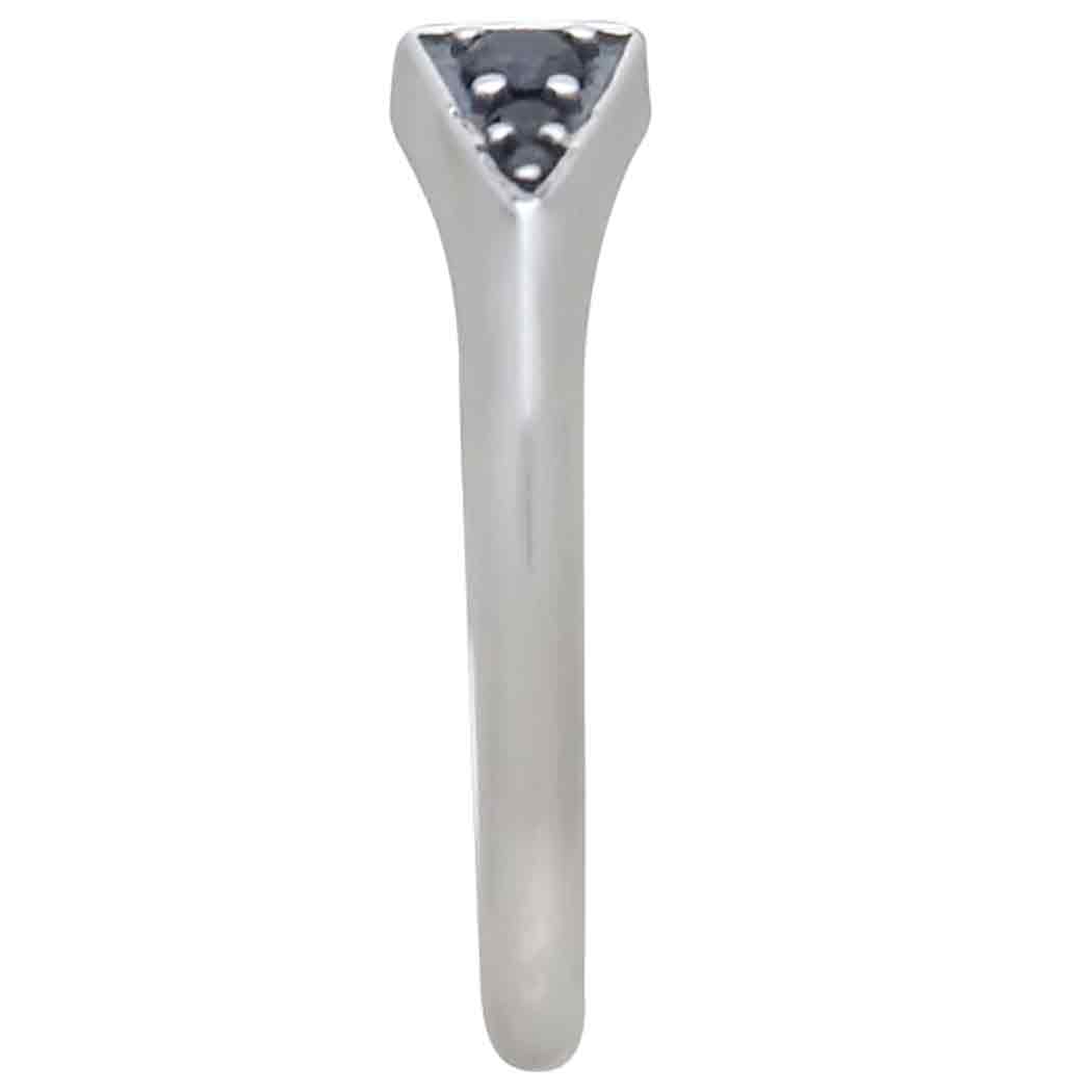 Make a statement when you list this sterling silver adjustable ring with black crystals. Three tapered crystals framed within triangle frames form a surprisingly sexy, sleek, and hyper modern ring. It looks as if the crystals float atop your fingers.
