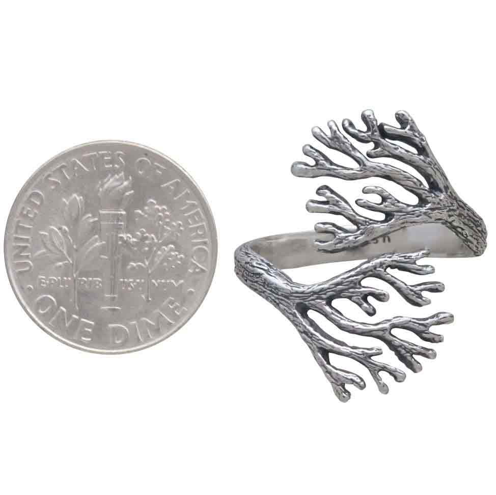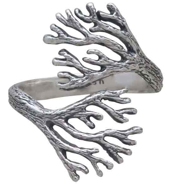 This sterling silver adjustable sea coral ring branches out in an eye-catching pattern. The lifelike texturing covers the entire ring's surface. Sea coral has been used throughout time as talismans against fear. Seafarers would fasten coral to the masts of their ships to safeguard against storms and shipwrecks.