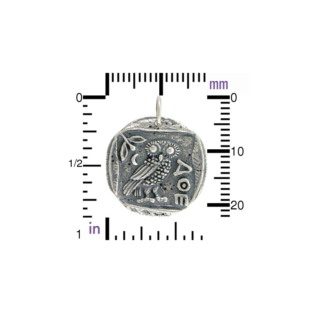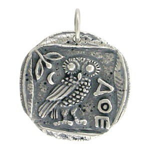 Sterling Silver Ancient Coin Charm with Athena's Owl. Replica of an ancient Greek coin. In Greek mythology Athena is the goddess of war, civilization, wisdom, strength, strategy, crafts, justice and skill. In Homeric poetry, Athena's most common epithet translates to bright-eyed or with gleaming eyes, much like an owl. Many scholars argue that Athena is the owl herself - she is wisdom.