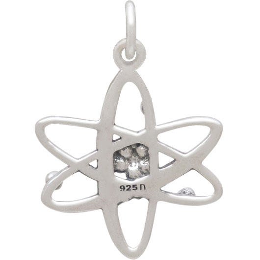 A century ago most people would not have recognized this sterling silver atom charm for what it is - a classic representation of an atom. But today most people know about atoms. We know everything is made up of atoms, that the center of the atom is called the nucleus, and is composed of the neutrons & protons; and that the nucleus is orbitted by super-speedy particles called electrons.