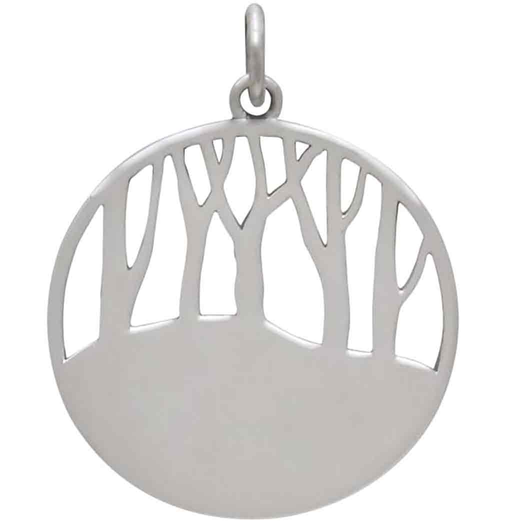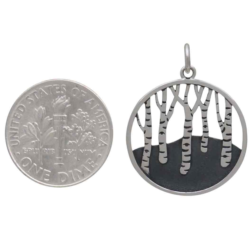 This sterling silver birch tree forest pendant features a deeply oxidized background, and striped tree trunks, adding depth and contrast. Renowned for their beauty, birch trees are also valued by healers for its analgesic, anti-inflammatory, and calming medicinal properties.