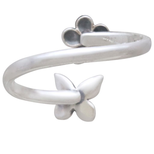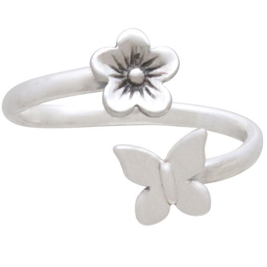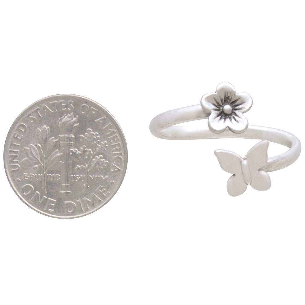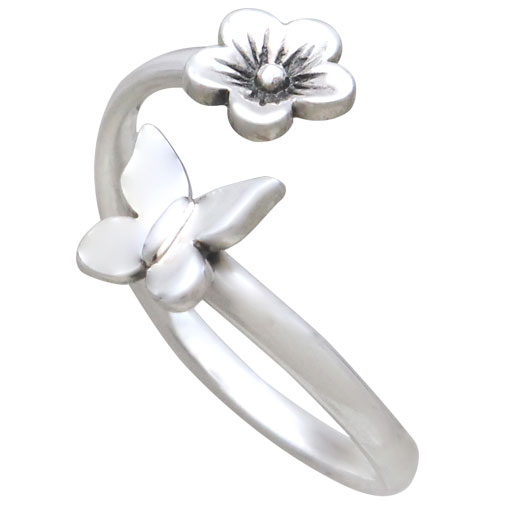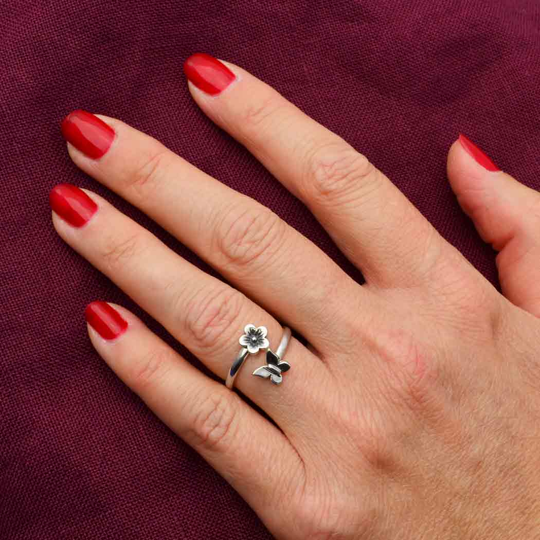 This adjustable ring features a sterling silver band, cherry blossom flower, and butterfly. Adjustable rings are easy to add to your listings because you don't have to worry about the ring size. The ring comes as a size 7, but can be adjusted smaller or larger.