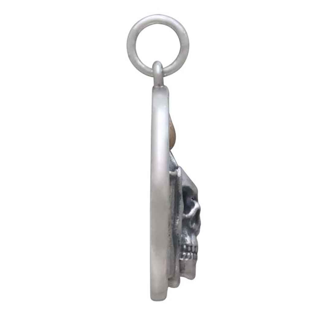 Unleash your edgy side with this hauntingly beautiful sterling silver candle and skull pendant with bronze flame. It features a beautifully detailed skull resting beside a melting candle, symbolizing the balance between life and death. The bronze flame adds a striking contrast and warmth. Perfect for those with a taste for the unconventional, this pendant is sure to make a bold statement and spark conversations wherever it's worn. Find more Talisman Charms to add to your selection.