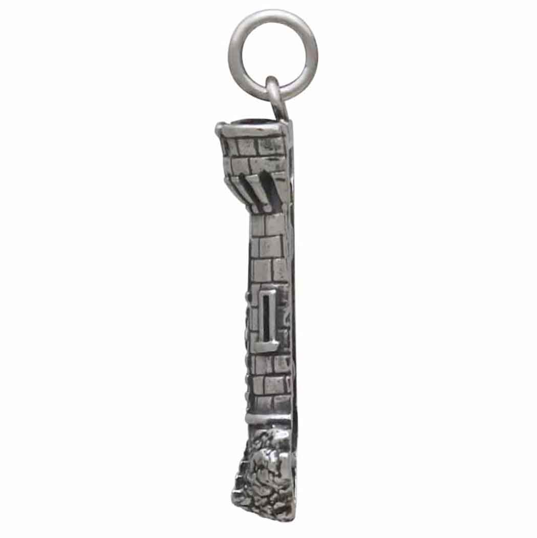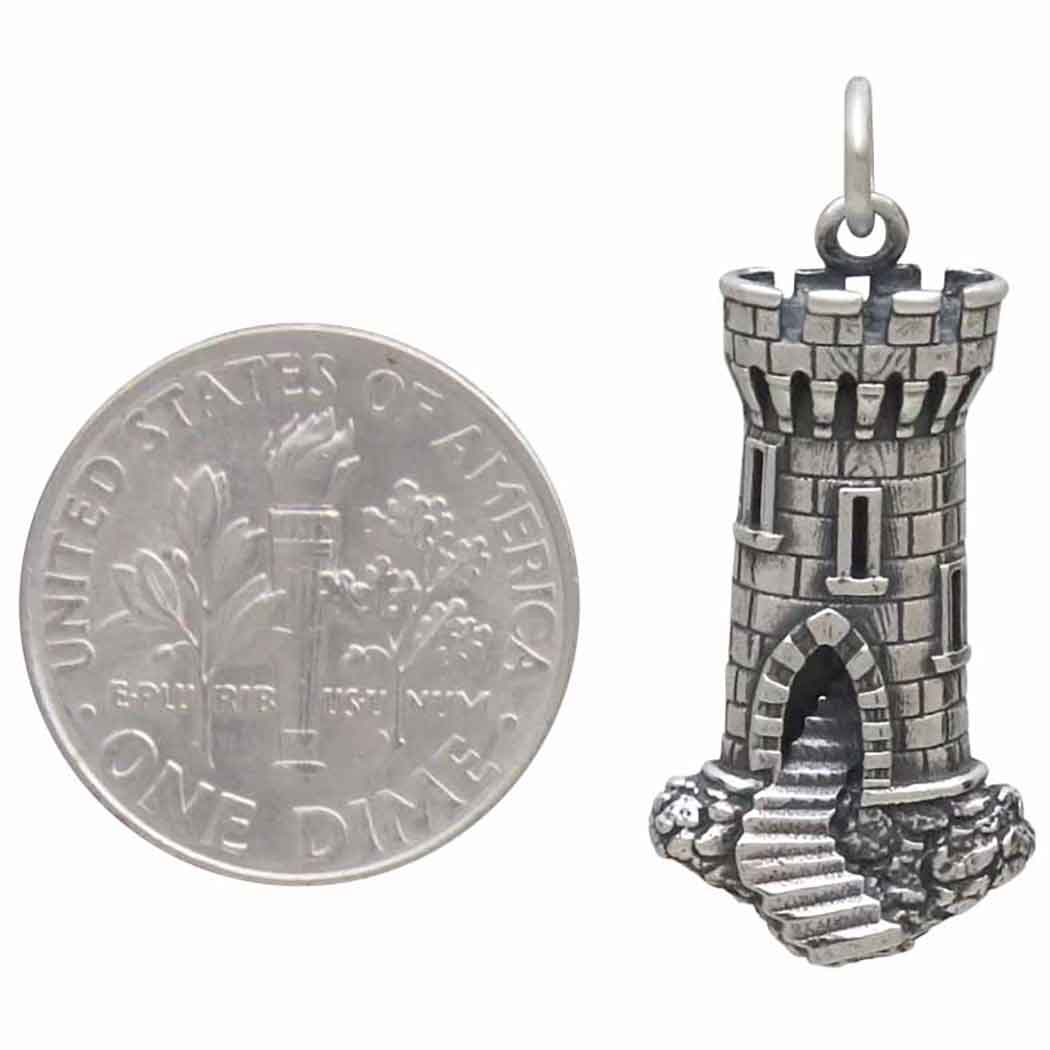 This sterling silver Castle Tower Charm exudes whimsy and enchantment, showcasing detailed craftsmanship that brings to life a miniature castle tower. Complete with stone textures and an arched doorway, making it a perfect for lovers of fantasy, history, or architecture, this charm is sure to spark imagination and captivate hearts. Whether worn on a bracelet, necklace, or anklet, it adds a touch of magic to any ensemble. Drop this medieval castle charm onto Finished Chain for a quick & easy necklace.