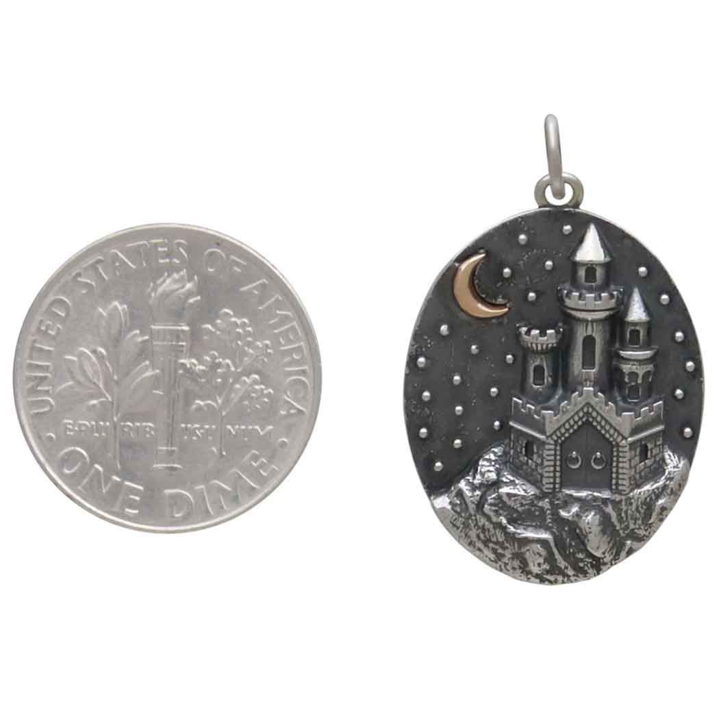 Introducing our enchanting Sterling Silver Castle with Bronze Moon Charm, a whimsical addition to any jewelry collection. This charm features a detailed sterling silver castle, complete with turrets and an arched gateway, evoking the romance of fairy tales and medieval lore. Set against a backdrop of a textured silver disc that suggests a starlit sky, a crescent bronze moon adds a warm contrast and celestial charm. The intricate craftsmanship is evident in every brick and window of the castle’s design, making it an ideal piece for those who cherish fantasy and the magic of bygone eras. Whether worn on a bracelet or as a pendant on a necklace, this charm is sure to spark imagination and add an element of storybook magic to your ensemble.