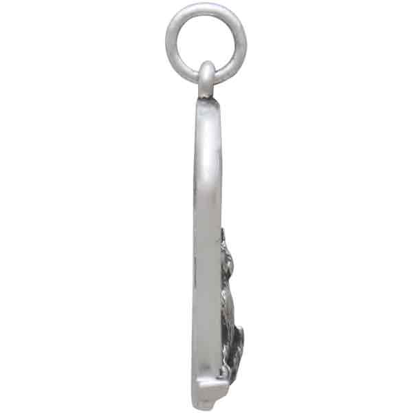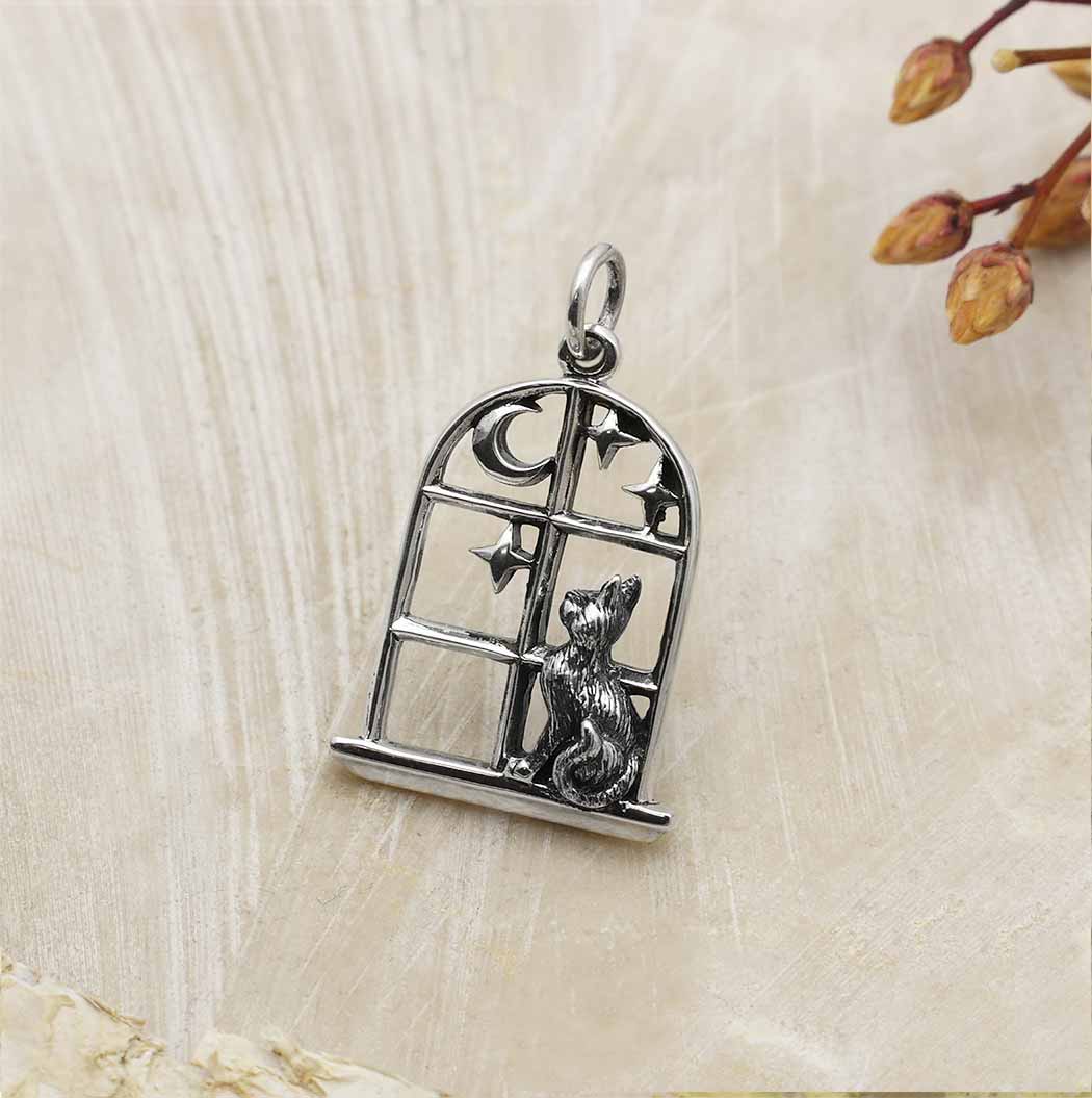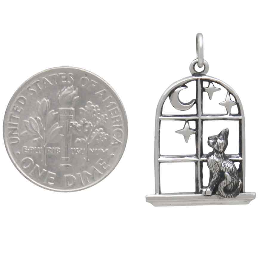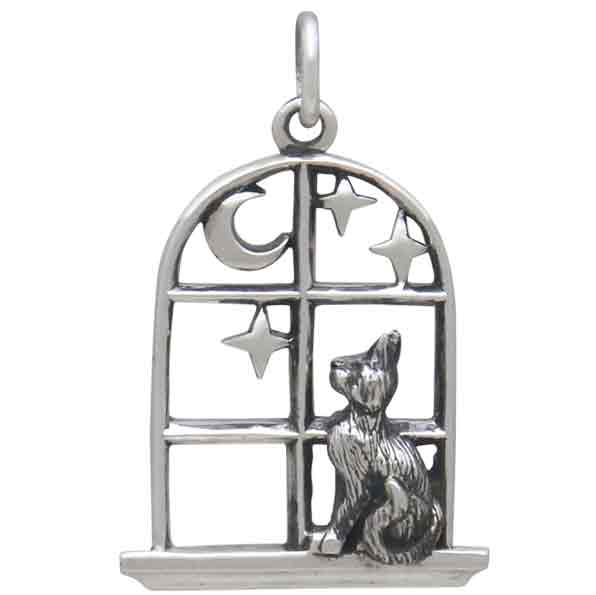 This sterling silver cat in the window charm invites you to ponder the stars and the moon, and all that lies beyond. It's like the beginning of a cosmic fairytale that this little kitty has already written herself into. Indulge your customers' far flung imaginations, and their love of cats when you list this kitty in a window charm.