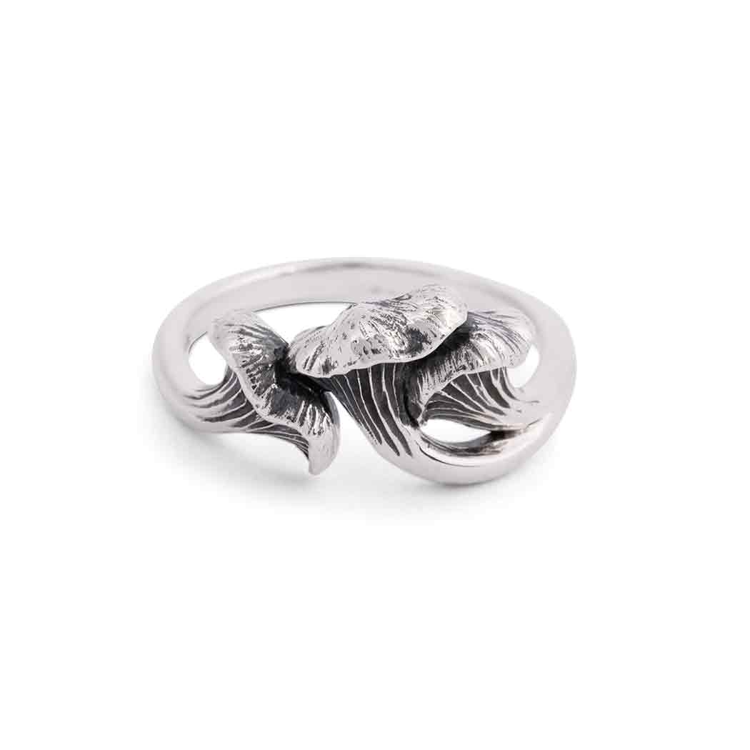 Mushroom lovers! Rejoice in the delicious details found on this sterling silver chanterelle mushroom ring. The delicate-looking gills & wonderfully textured, generously-sized caps are deeply oxidized to highlight all the beauty found there.