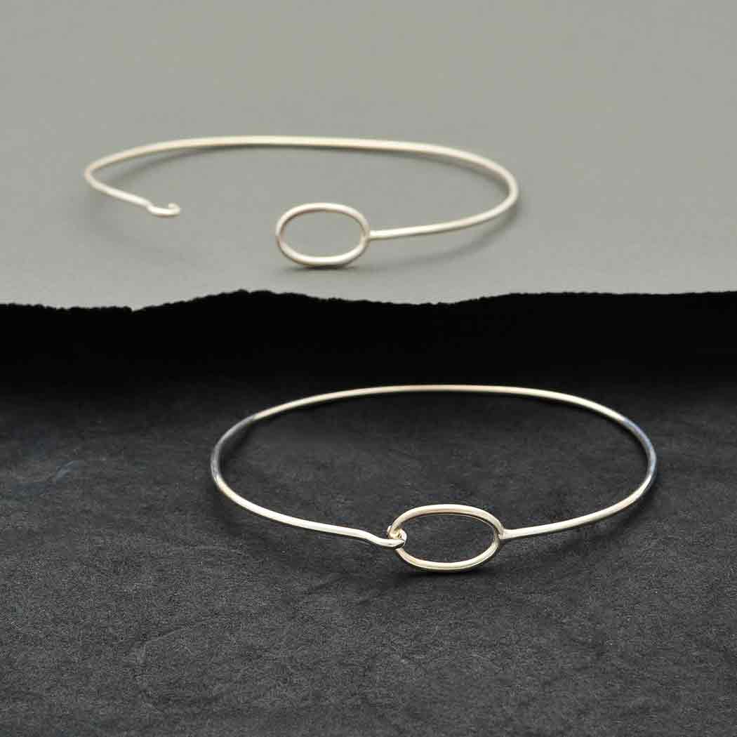 Sterling Silver Charm Bracelet with Hook & Eye Closure. Sold per piece. This simple silver bangle bracelet easily opens and closes, and is ready to wear as-is. Your customers have the option of stringing on favorite charms when the bangle is open, or attaching charms and gemstones to the open oval at the top of the bracelet. Either way, this bracelet is a must-have for your jewelry collection!