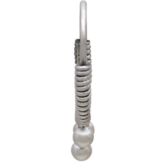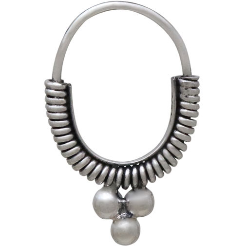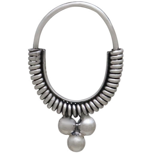 Sterling silver coiled hoop earrings with three dots have an ethnic feel tempered with modern simplicity. The workmanship is exquisite. The coils are handwrapped with sturdy wire. The inner wire-wrapped surface is shielded with a sterling silver plate and three silver spheres add drama. The result is clean tidy oval hoop earring with a significant feel - great for everyday wear (some of us sleep in ours!)