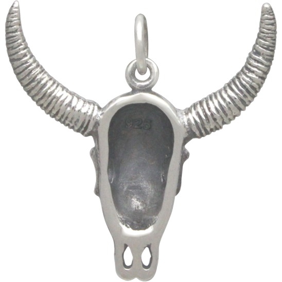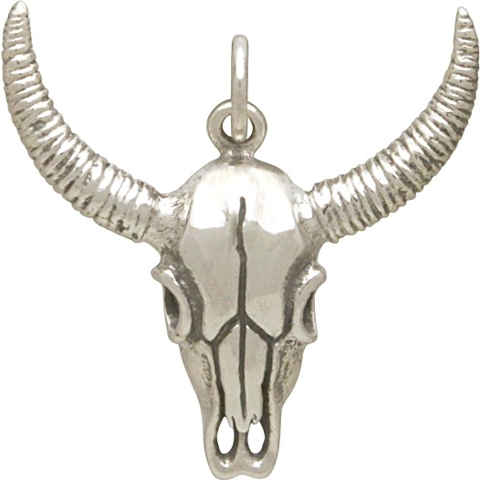 Sterling Silver Cow Skull Pendant. Use this Cow or Bull Skull Pendant as a centerpiece your Western Inspired Jewelry! This Cow or Bull Skull is beautifully detailed. It is designed on all sides, but the skull itself is hollow, keeping it lightweight for wearing. Cows are widely known as gentle creatures. The cow skull is often made into tribute for a well appreciated animal who has played a significant role. Create a cool design by simply stringing this silver skull charm onto chain. Rustle up a whole herd of great styles in our Skull and Bone Collection!