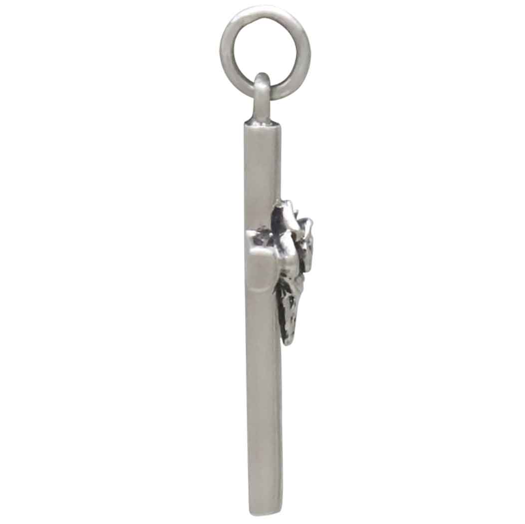 This sterling silver cross charm, adorned with a beautifully detailed rose, is a stunning representation of love and faith. The charm features a simple yet elegant cross design, with a single blooming rose gently wrapped around it, symbolizing the intertwining of love and spirituality. The rose, with its delicate petals and leaves, adds a touch of grace and romance to the classic cross.