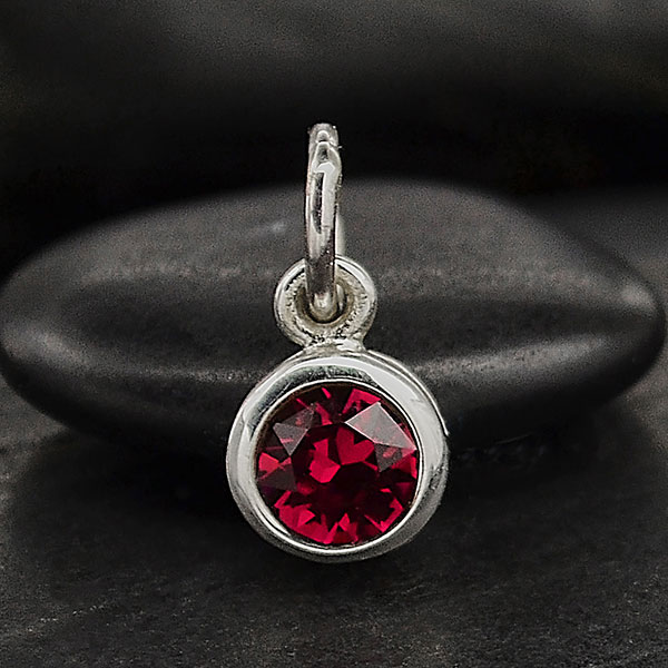 This sterling silver birthstone charm features a ruby colored crystal. Birthstone charms are great for celebrating loved ones. These charms are perfect for new mommies, grandmas, sisters, or any special person in your life!