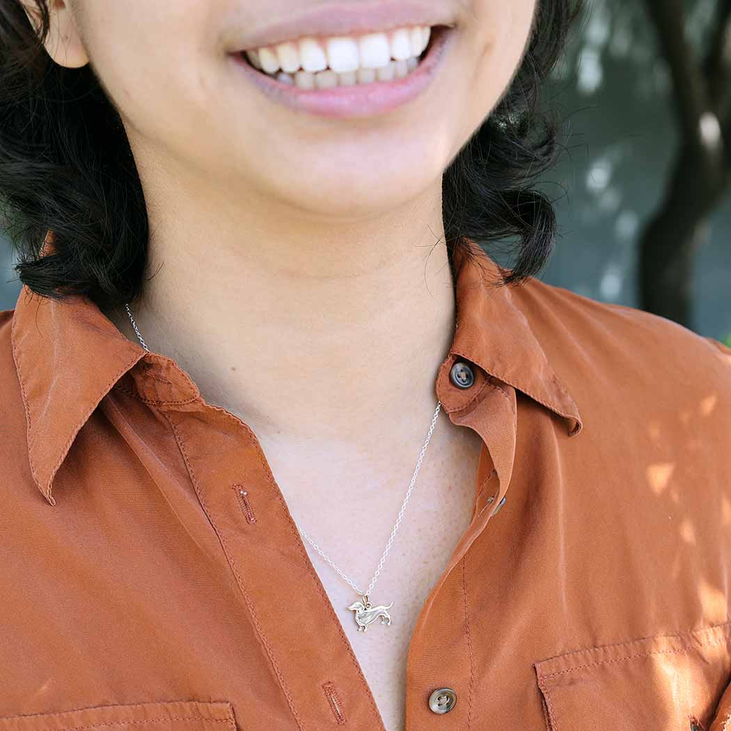This sterling silver dachshund dog necklace celebrates one of the most popular dog breeds of all time - AKC ranks dachshunds in the top ten! Its long, low sihouette is unmistakable, having earned its popular nickname - the wiener dog. While the dachshund is ridiculously cute, it's vivacious personality is what really earns this pooch its super-star status. Weiner dogs are stubborn, courageous, alert, smart, and tireless!