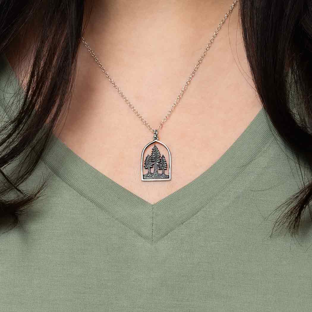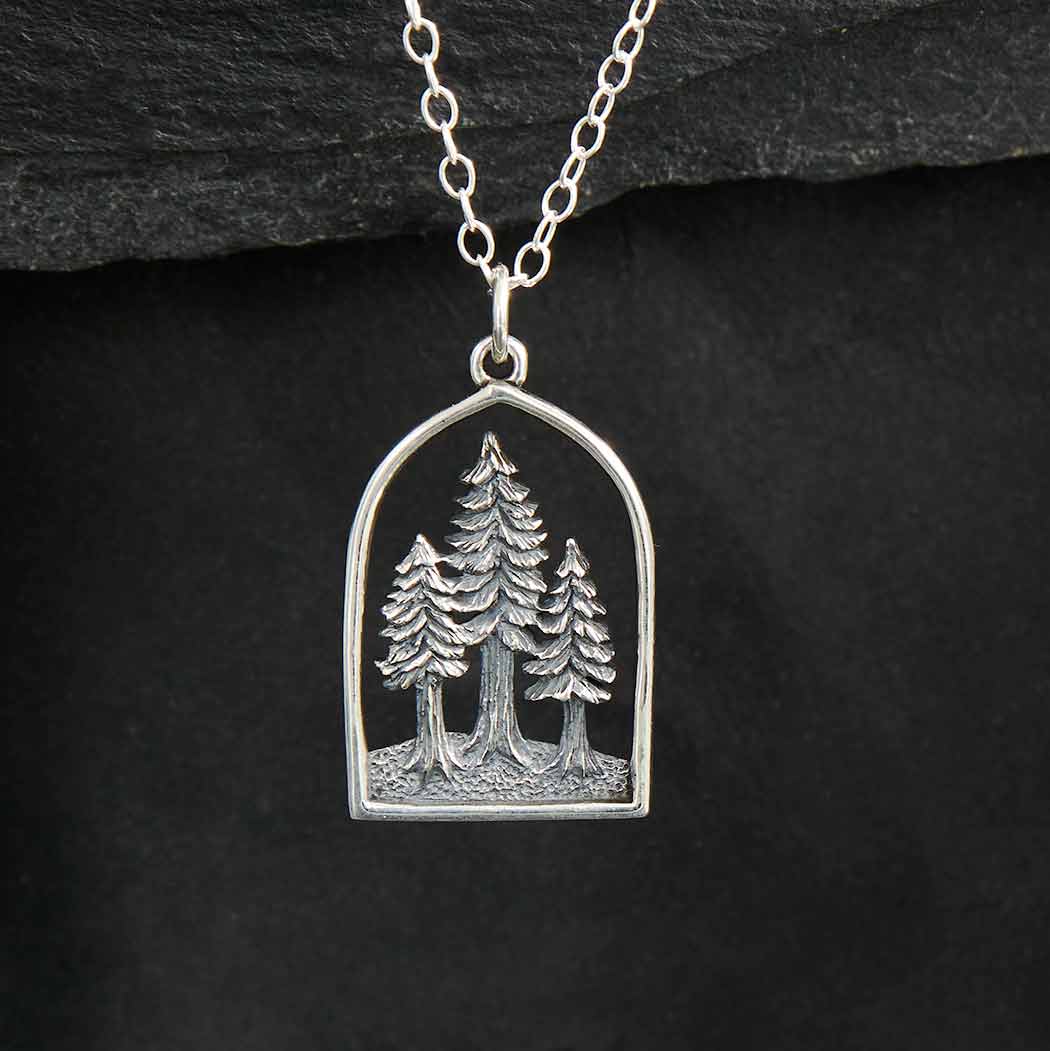 This sterling silver 18 inch dimensional pine tree forest necklace in a frame elevates it from enchanting to sublime. A stand of trees becomes a cathedral forest. Many outdoor enthusiasts experience spiritual awakening when they round a corner and run smack dab into divine beauty found deep in the forests. It's why we're smitten with the saying "And into the forest I go, to lose my mind and find my soul."