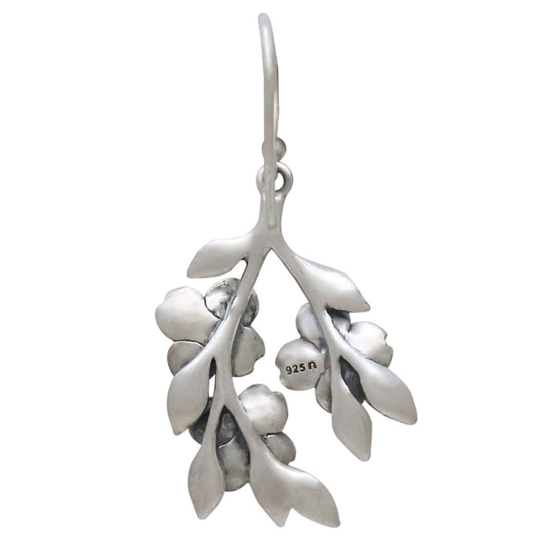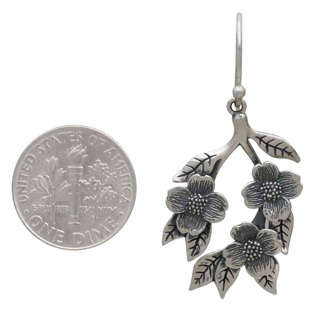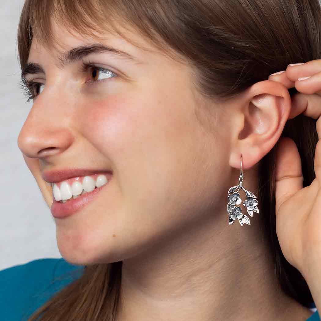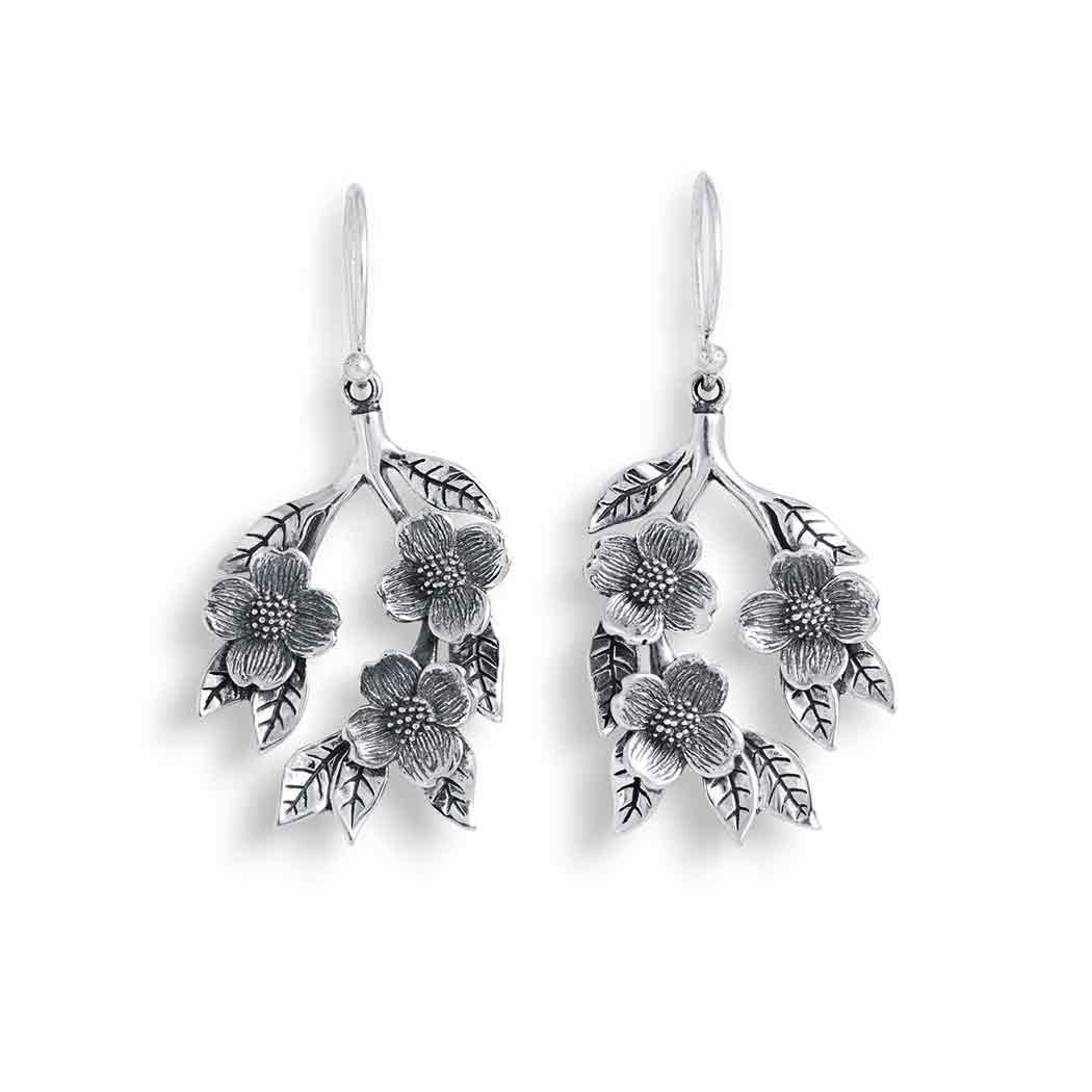 These sterling silver dogwood flowers dangle earrings feature three detailed blossoms, layered petals and leaves, all deeply oxidized to add depth and contrast. A beautiful focal point for special occasions, like engagements, Mother's Day, Valentine's, and Easter. In flower symbolism, dogwoods are thought of as sacrifice, strength, rebirth, and purity. Legendary to Christians as the tree used to make the wooden cross, dogwood trees are prized and in full bloom around Easter. The blossom's four petals represent the cross and the center cluster as Jesus' crown of thorns.