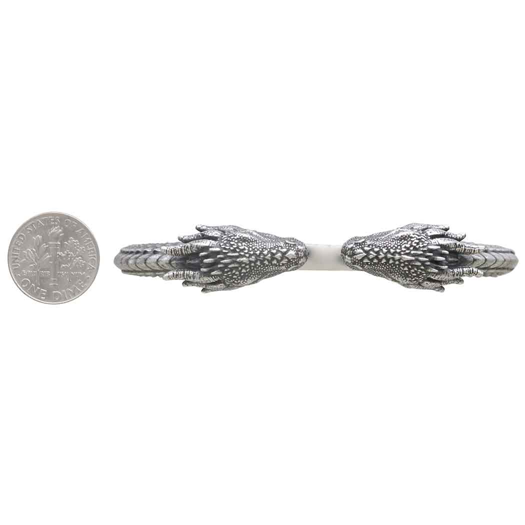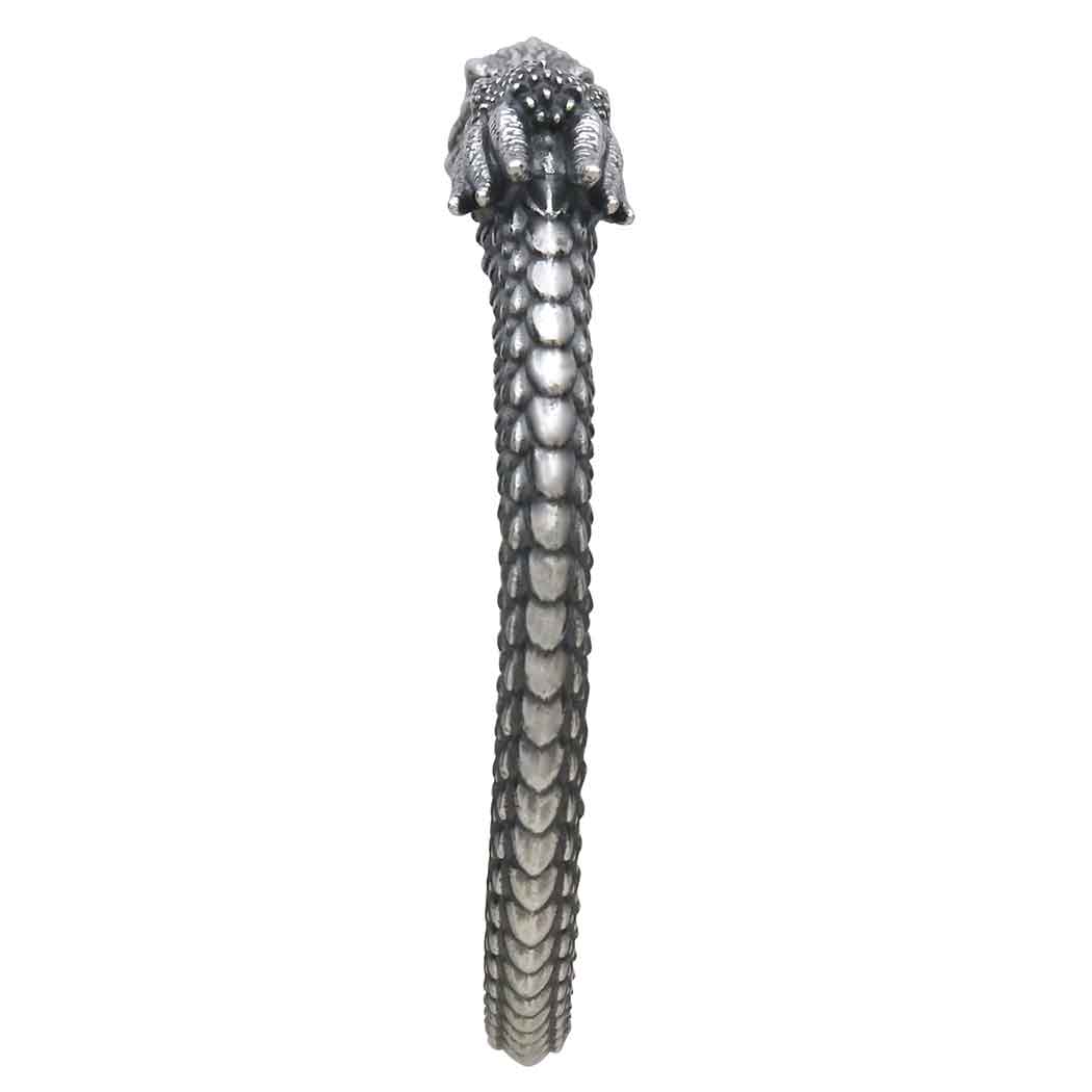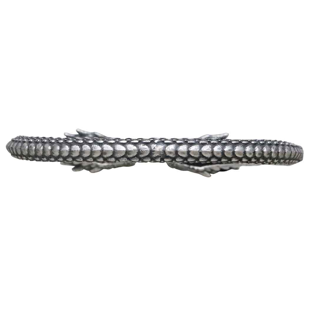 Channel the spirit of dragons—the guardians of secrets and magic with this sterling silver dragon cuff bracelet. The bracelet is open-ended, with each end adorned by an beautifully detailed dragon's head. The dragons' heads are finely sculpted, capturing their fierce expressions and the textured detail of their scales and horns. The body of the bracelet is crafted to mimic the sinuous form of a dragon's body, with overlapping scales running along its length, giving the bracelet a lifelike texture that adds depth and dimension.