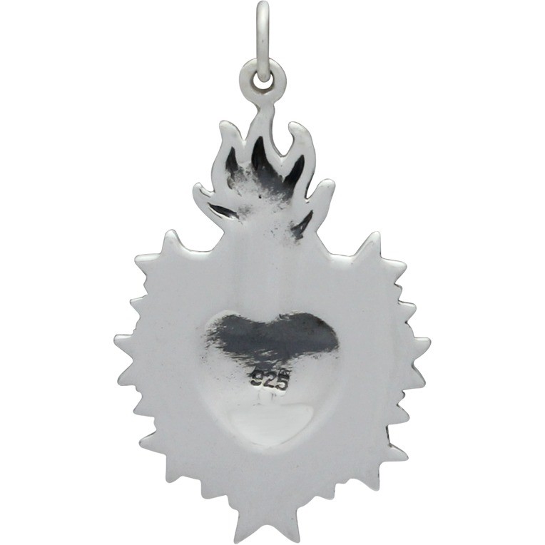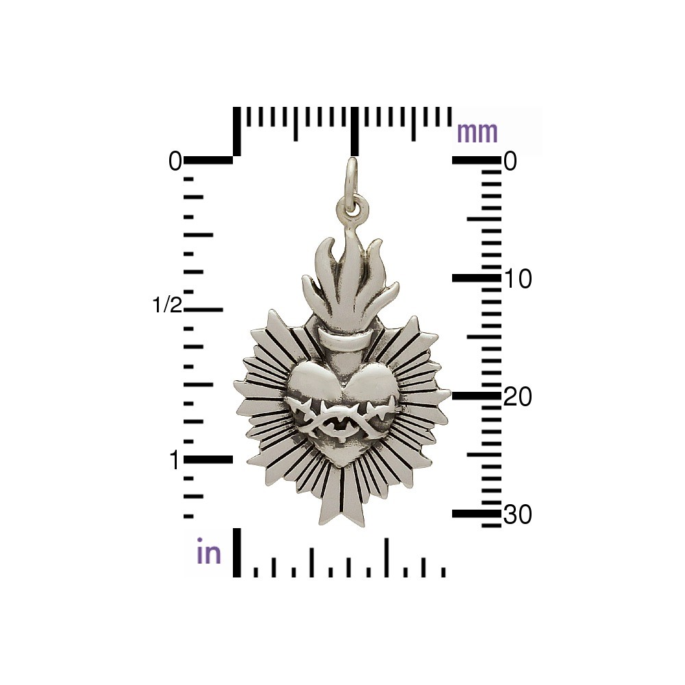 Sterling Silver Sacred Flaming Heart with Thorns Charm. Within the Catholic faith, the sacred heart is a medieval symbol of Christ's sacrifice. It signifies the redeeming love of God as the source of illumination and happiness. This radiant design is romantic and fierce with beautiful detailing on the thorns and rays of light. Wear it close to your own heart as a comforting reminder of faith. Find more Hearts and Religious Charms.