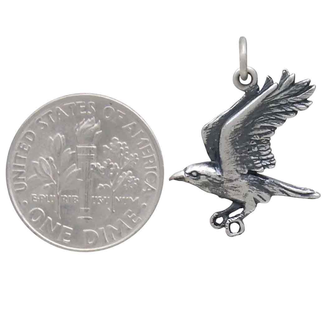 This sterling silver flying raven pendant is fierce, and drawing you in with her sense of purpose. Depicted in profile, designed on both sides, and with talons you can attach whatever you can dream up, this bold raven is a jewelry designer's dream. Not only is she beautifully feathered, she is versatile and can be used in so many ways on necklaces and earrings. In myth and legends, ravens symbolize loss, transformation, and hope. While the raven is associated with darkness, death, and shapeshifting, it also connotes intelligence and bravery.