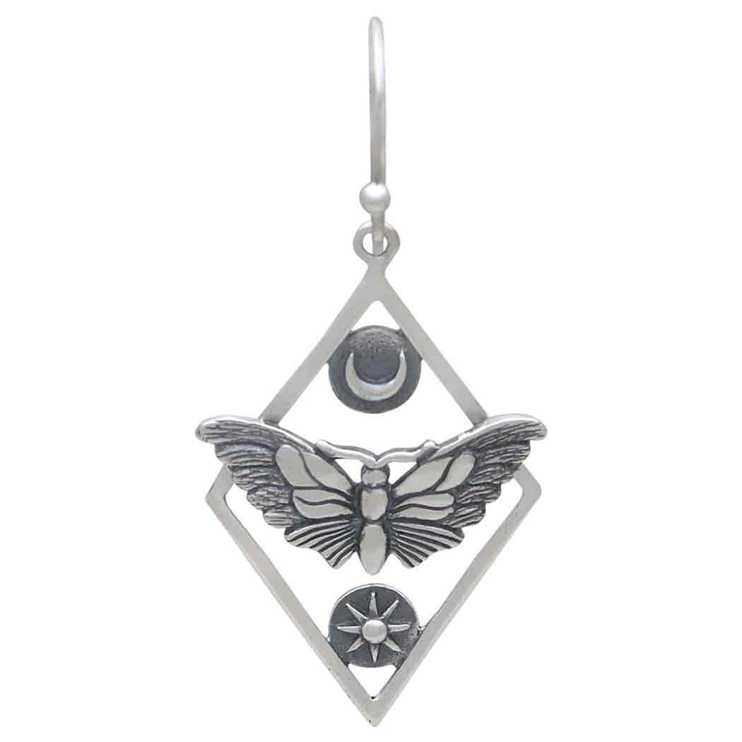 Channel the allure of the moth when you offer these sterling silver geometric moth dangle earrings. The diamond shape is not only a beautiful way to frame the moth, but also provides spaces to attach more charms and gemstone beads.