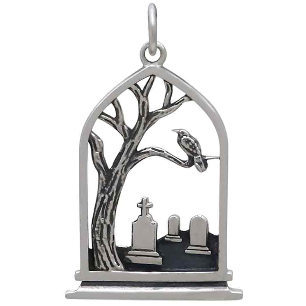 Create a scene when you make jewelry with this sterling silver graveyard charm. It is chocked full of meaning so you can design symbolic jewelry with Gothic appeal. Keep it simple by dropping onto finished chain, or go all out by embellishing with more charms and beads.