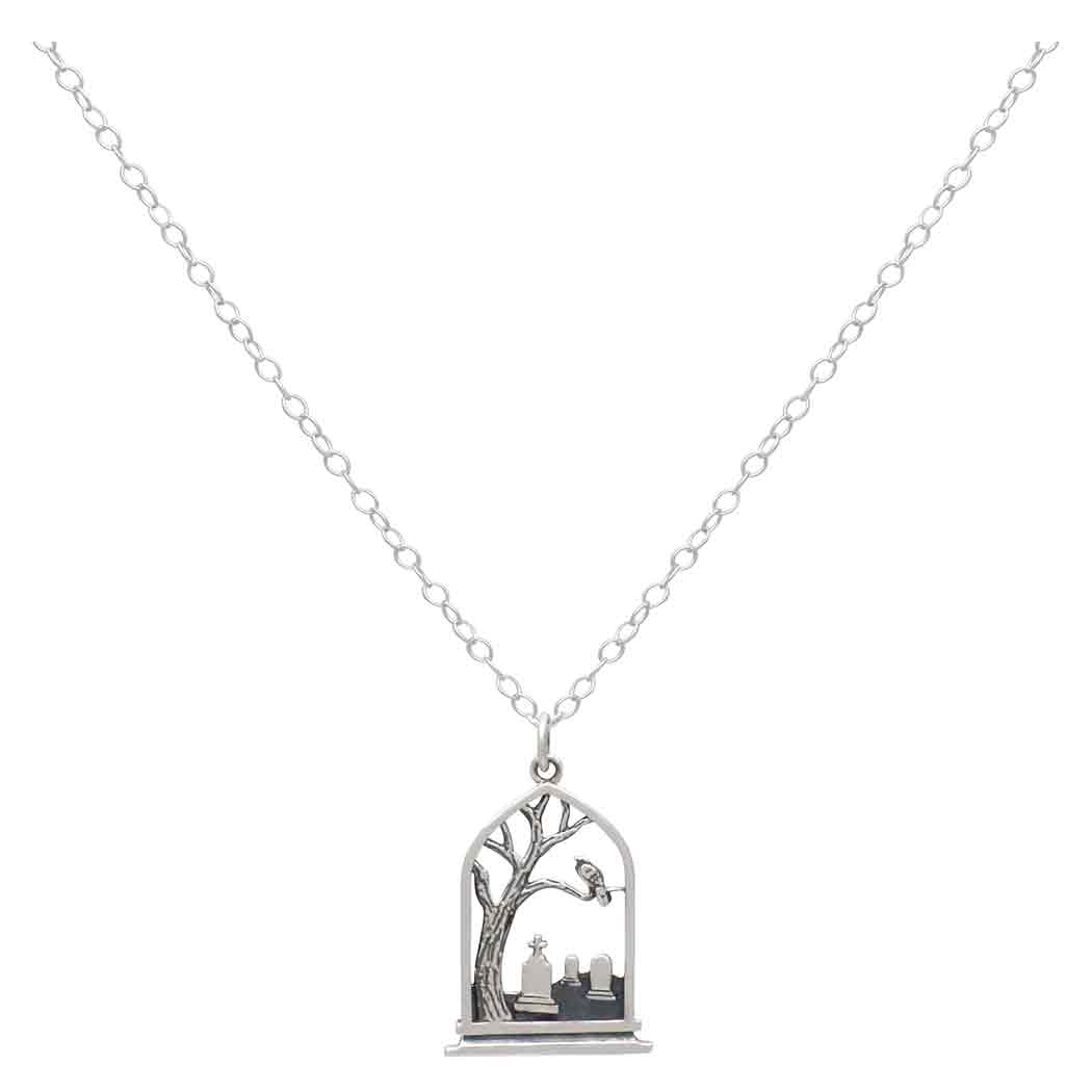 Create a scene with this sterling silver graveyard charm necklace. It is chocked full of meaning so you can offer symbolic mourning jewelry with Gothic appeal. Tombstones are obvious markers for remembering the departed, but the ever watchful raven is also a symbol of hope and transformation. Myth and lore relate the raven as a guardian in worlds beyond the physical, essentially guiding the departed through spirit realms. Be sure to stock this necklace in the fall around Halloween! Find Talisman Charms and Halloween Charms to offer your customers.