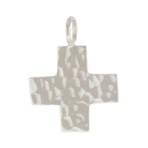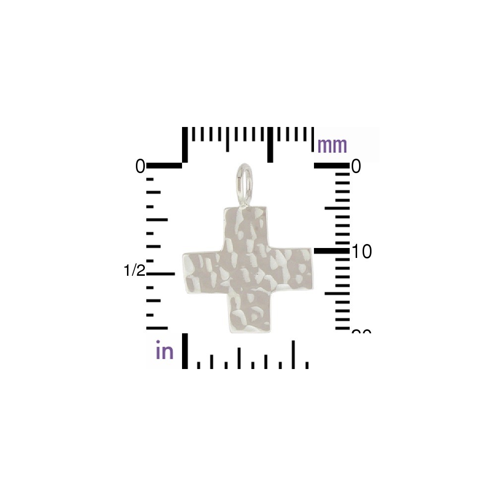 This hammered sterling silver cross charm measures 20mm in length. This cross pendant has a lovely shiny hammered finish. String this tiny charm onto a finished chain for an easy and sweet necklace. This also makes a great addition to any charm bracelet! Browse more of our Religious Charms.