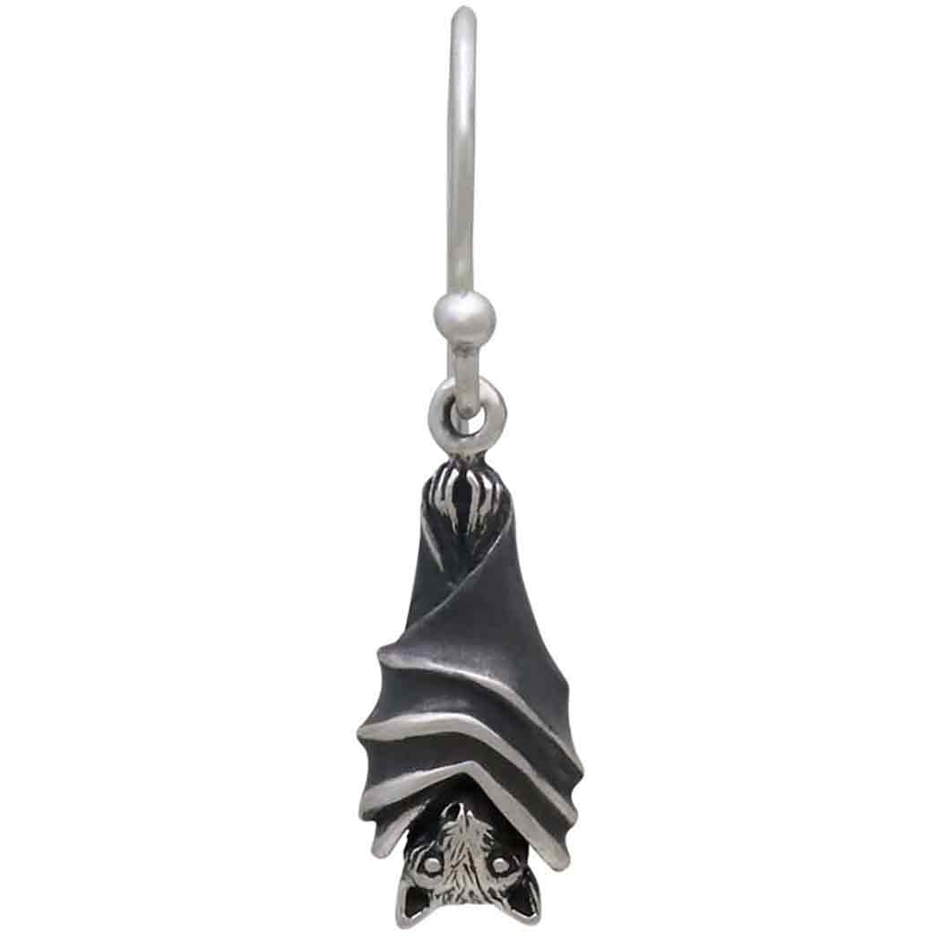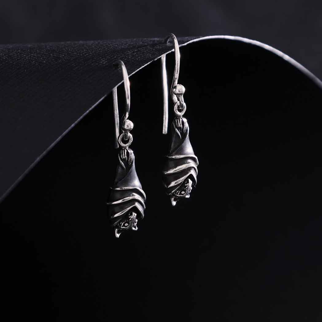 Flaunt your darker side with these sterling silver hanging bat dangle earrings. With her wings wrapped around herself like a cloak, this little bat is taking a long deserved rest. These bats are lovely from all sides - the ribbed wings wrap from front to back, and she has a sweet face with a long nose and pointy ears.
