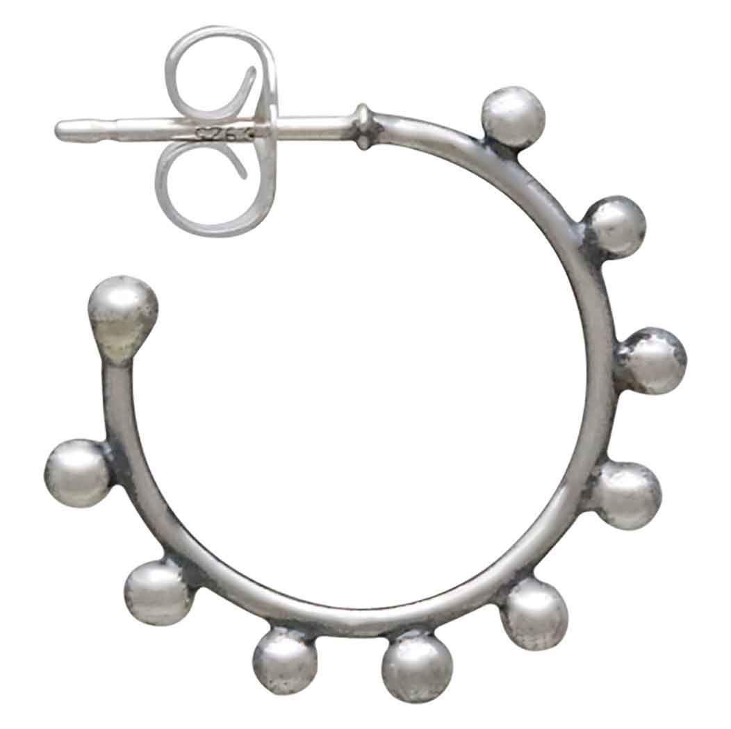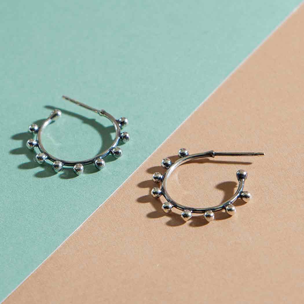 Elevate your style with these sterling silver hoop post earrings featuring a series of small, spherical silver beads evenly spaced along the outer perimeter of the hoops. This granulated detailing adds texture and visual interest to the classic hoop silhouette, making these earrings an elegant accessory that can enhance both casual and formal looks. Discover more Finished Earrings to add to your shop.