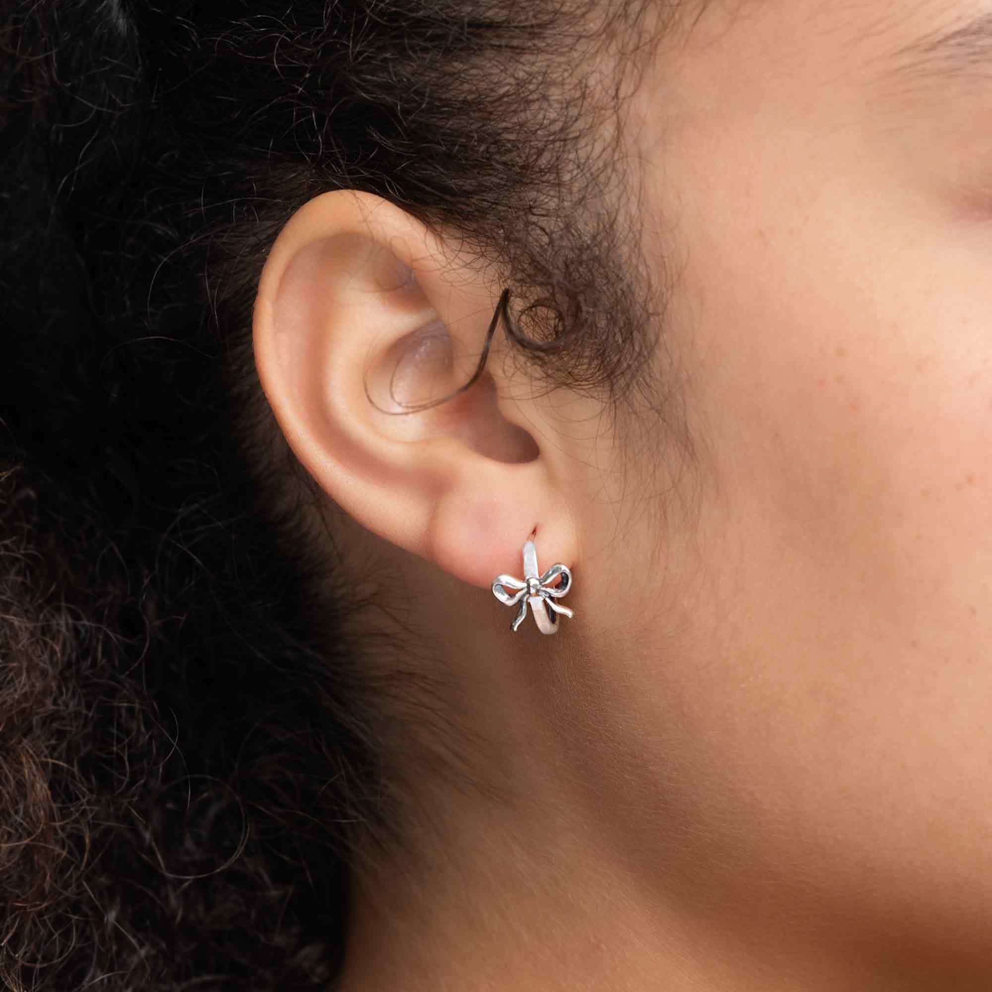 Playful meets polished in this Sterling Silver Huggie Hoop with Bow. A delicate, slightly droopy bow rests gracefully against a sleek huggie hoop, creating the perfect blend of charm and sophistication. These earrings bring subtle movement and shine — ideal for everyday wear or a feminine finishing touch.