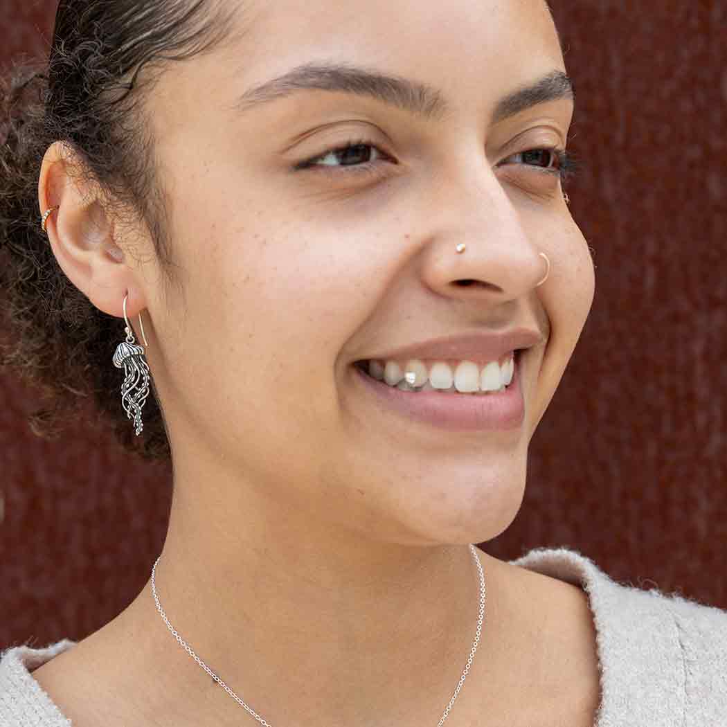 Sterling Silver Jellyfish Dangle Earrings. The languorous movements, smooth and silky spiraling tentacles, bobbing and parachuting top: the jellyfish. An interesting and wondrous creature, the jellyfish mainly lives in warm seas using the currents and winds for its movement. Though extremely delicate and soft, this creature can be a deadly encounter with its stinging and poisonous tentacle barbs.