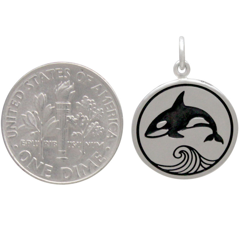 Like the animal it depicts, this sterling silver killer whale charm is bold, striking, and graphic. The killer whale's black & white markings are unmistakable, and look like poetry in motion swimming the deep blue seas.