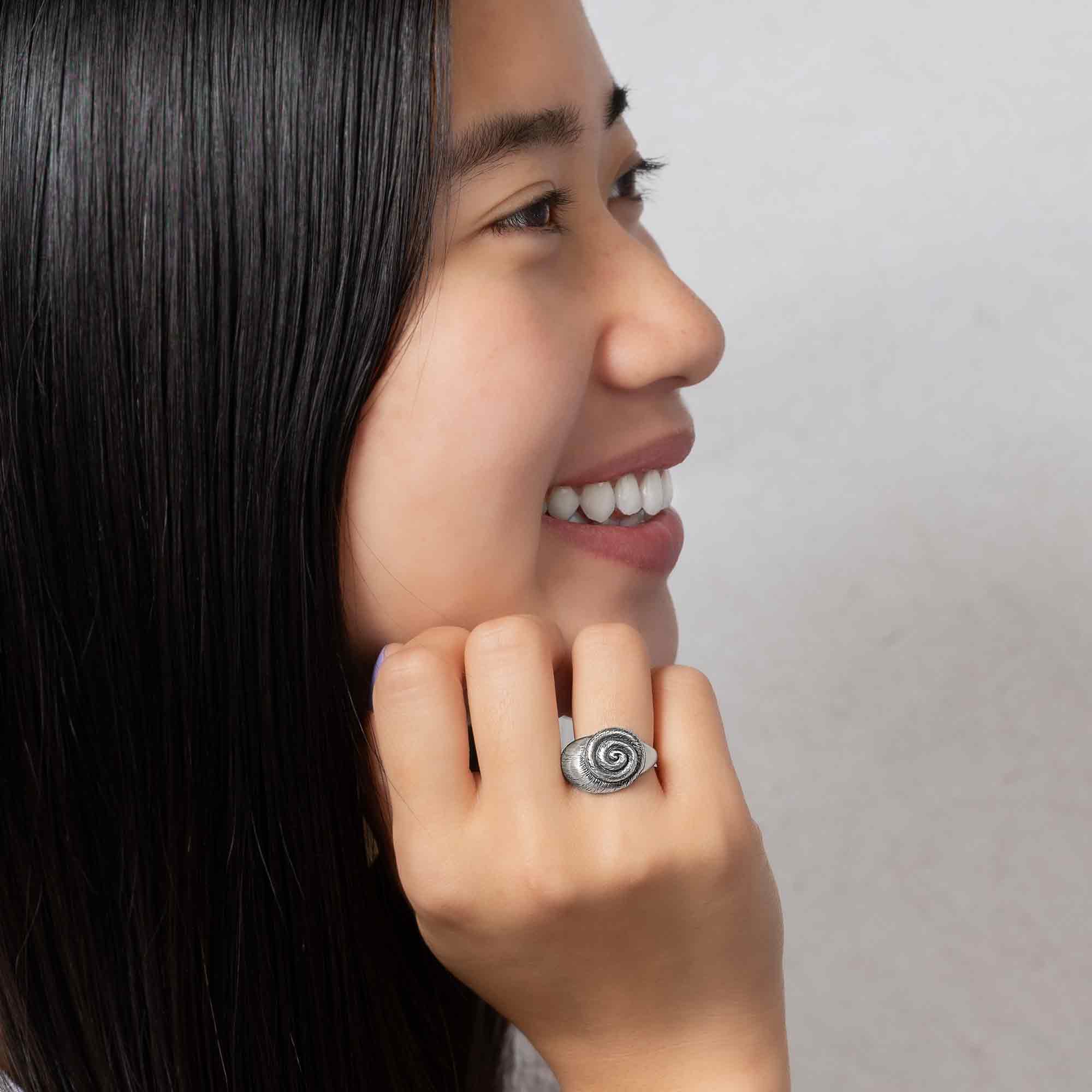 Capture the essence of the ocean with this stunning Sterling Silver Large Shell Ring. Featuring an intricately detailed spiral shell design, this bold statement piece brings a touch of nature's beauty to your jewelry collection. The textured surface mimics the organic ridges and curves of a real seashell, enhanced by an oxidized finish that adds depth and character.