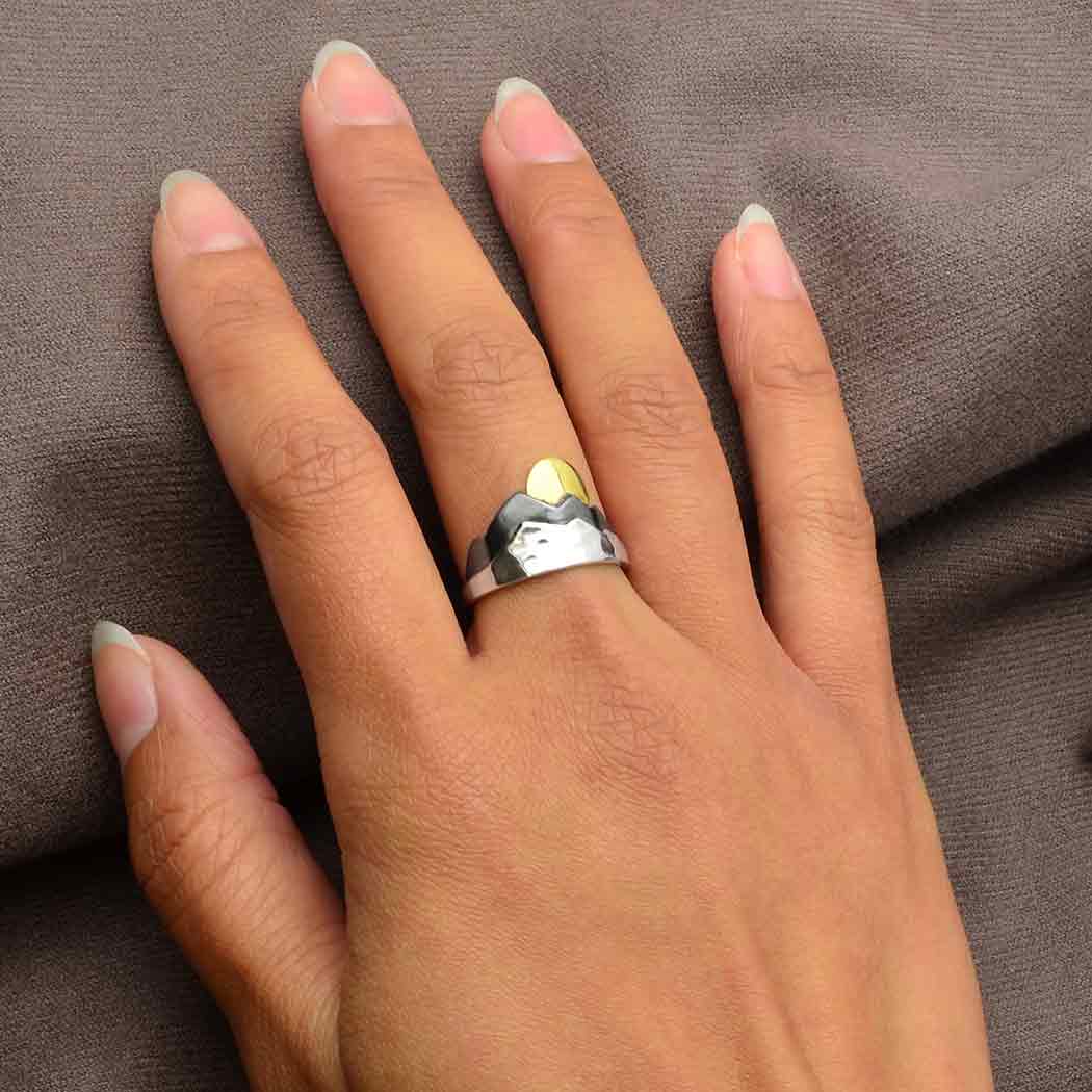 Appeal to your customers sense of adventure with this sterling silver layered mountain ring with bronze sun. This scenic ring features three layers - one hammered to evoke rugged mountain terrain, the next a smooth black finish like a mountain in shadows, and the third a warm bronze setting or rising sun.