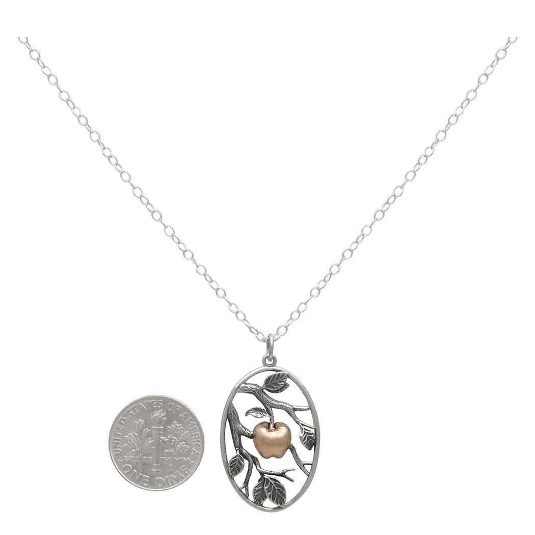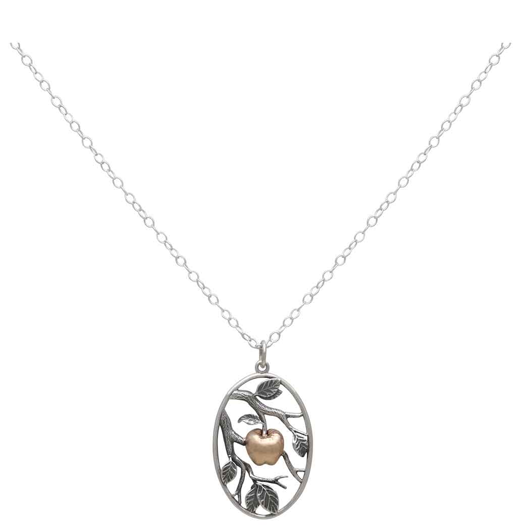 The composition of this sterling silver leaf necklace with bronze apple - how the leaves and branches frame one juicy apple - is delicious. Golden apples crop up a lot in myth and ancient lore, and tend to be fraught with tension and conflict. Most often they're symbols of immortality, temptation, hubris and sin. Whether it's Eve eating from the Tree of Knowledge, or Hercules stealing the golden apple of immortality, or the goddess of Strife dropping an apple at Paris' wedding sparking the Trojan War, the golden apple seems to be too delicious to resist. Shop for more Ready to Wear Necklaces.