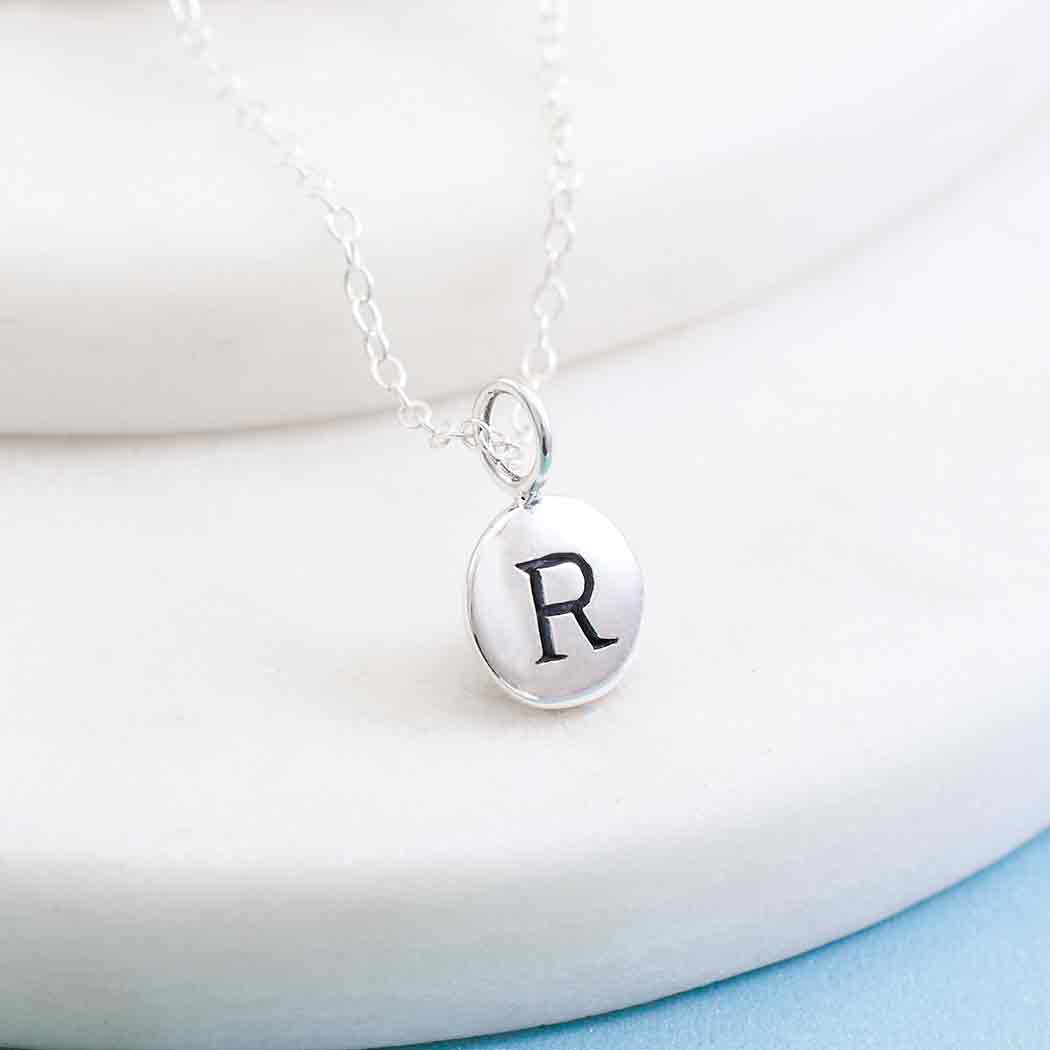 This small sterling silver letter disc "R" necklace is perfect for making personalized jewelry. Create a cluster necklace with birthstone charms, hobby charms, or word charms! The possibilities are endless with this letter charm necklace.