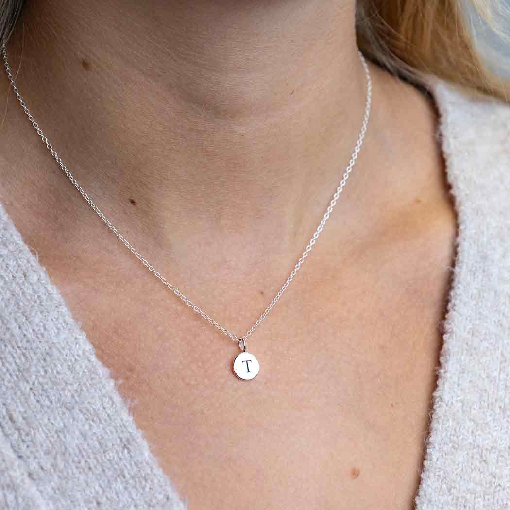 This small sterling silver letter disc "T" necklace is perfect for making personalized jewelry. Create a cluster necklace with birthstone charms, hobby charms, or word charms! The possibilities are endless with this letter charm necklace.