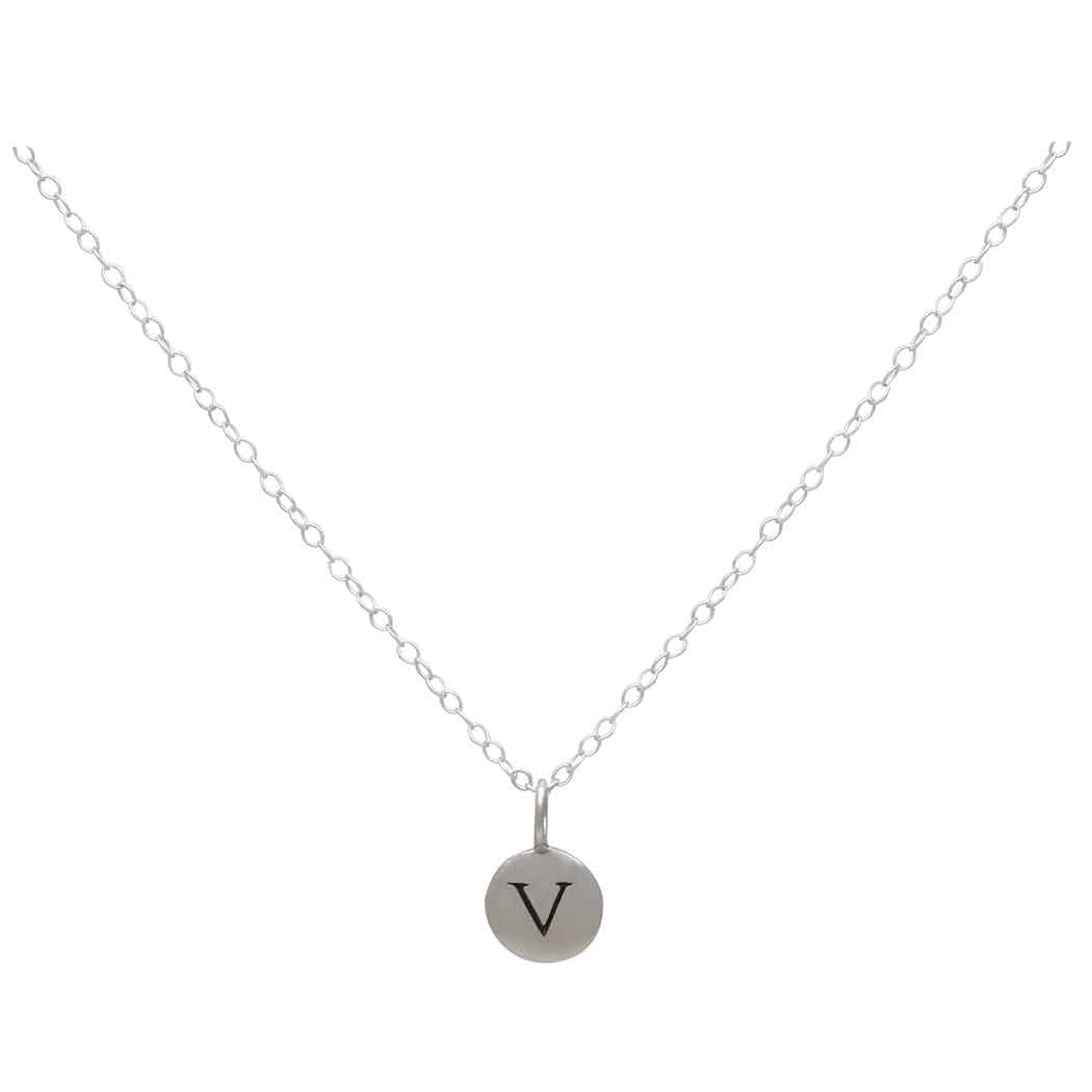 This small sterling silver letter disc "V" necklace is perfect for making personalized jewelry. Create a cluster necklace with birthstone charms, hobby charms, or word charms! The possibilities are endless with this letter charm necklace.