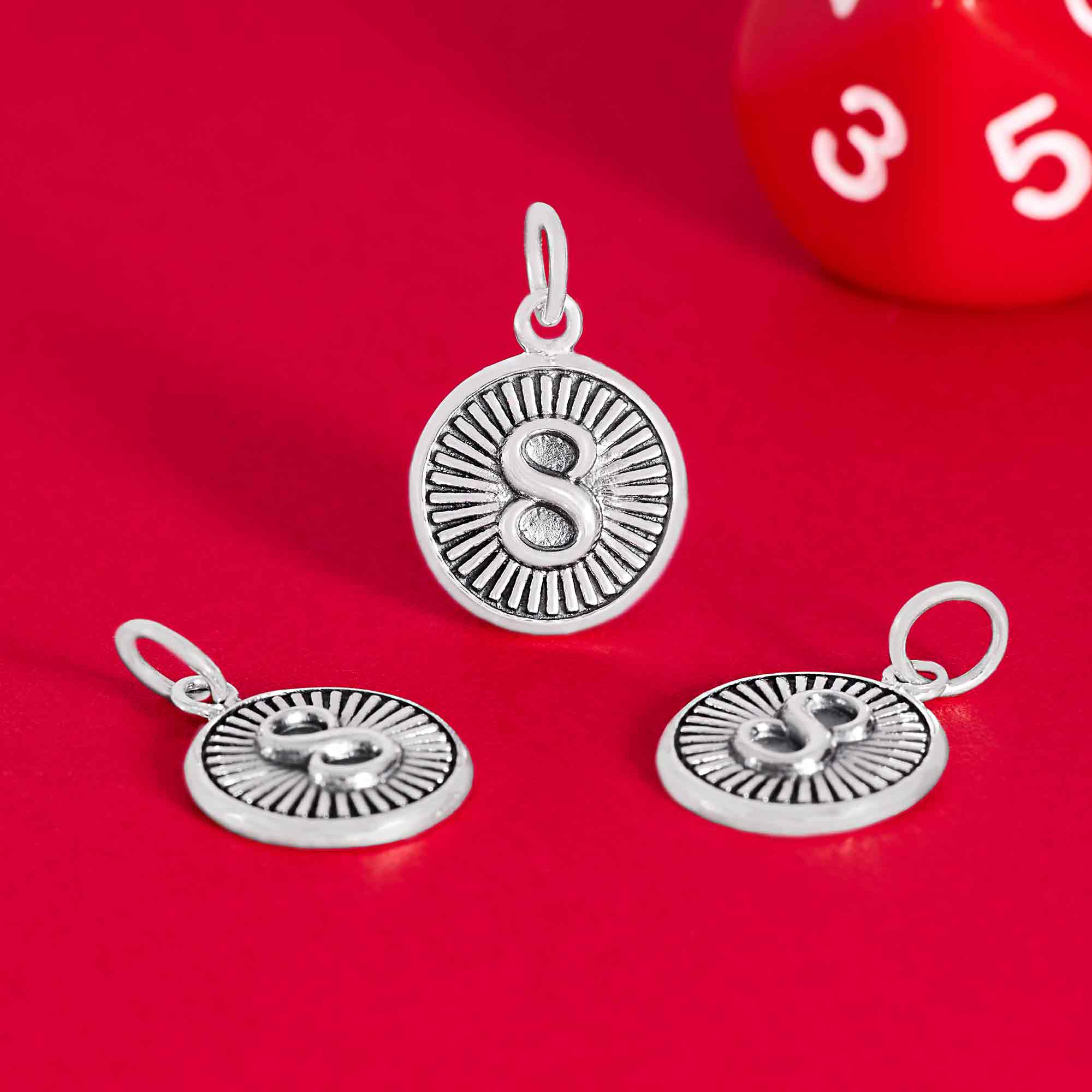 Invite prosperity and infinite possibilities with this Sterling Silver Lucky 8 Coin Charm. Featuring a bold number 8 set against a backdrop of radiating lines and oxidized detailing, this charm radiates balance, strength, and good fortune. The number 8 is a powerful symbol across many cultures—representing success, harmony, and abundance. Whether worn as a lucky talisman or a meaningful addition to a personalized jewelry piece, this charm is both stylish and symbolic.