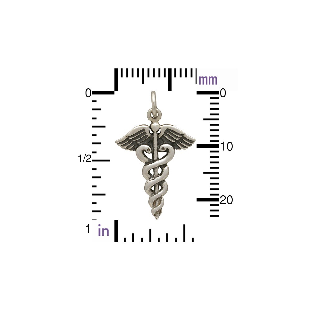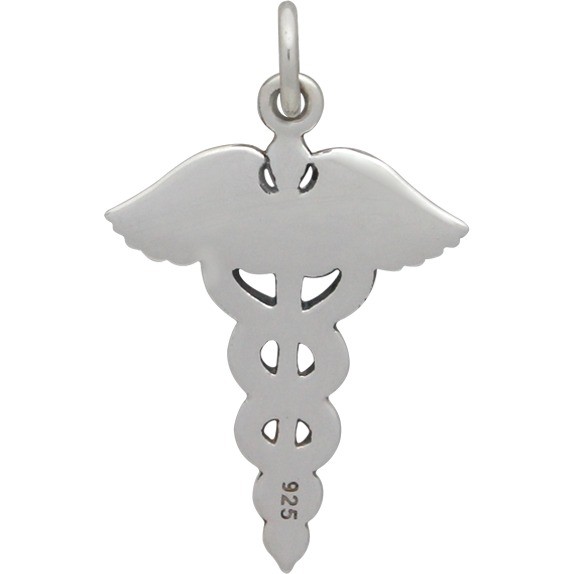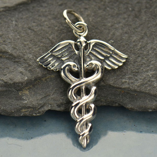 Sterling Silver Medical Staff Charm. Also known as the caduceus, was a staff carried by the Olympian god Hermes who was a messenger between the gods and humans, and also the patron of travelers. Doctors used to have to travel miles far way to care for the sick, so the symbol had always been associated with doctors and medicine. It has remained recognized ever since, and is still associated with medical organizations and those in the field.