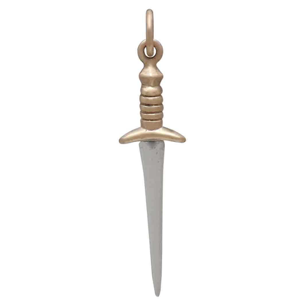 All parts of this sterling silver medium sword charm with bronze handle are wonderfully detailed. From the point to the pommel, this sword charm looks like a miniature of an actual Medieval sword. The pronounced quillion and the detailed grip are especially fierce!