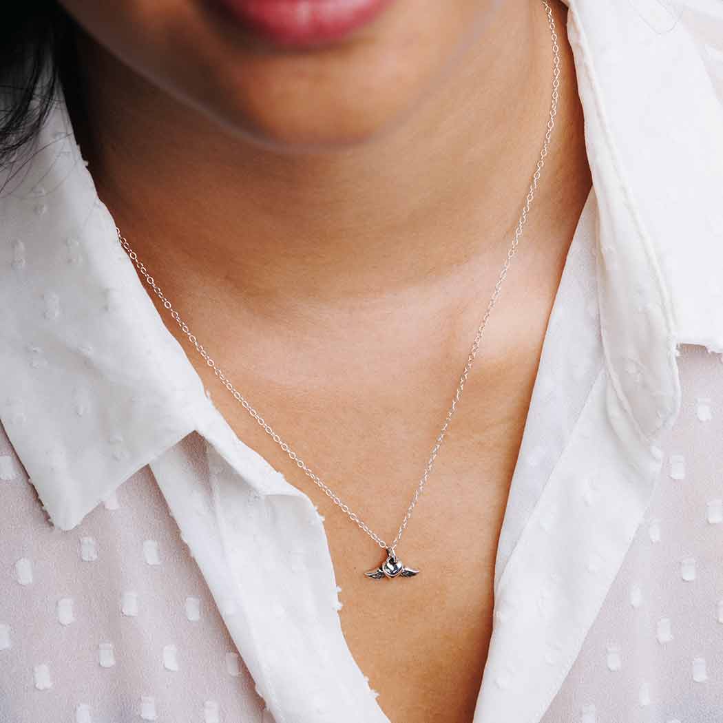 Express love, gratitude, and joy with this sterling silver mini flying heart charm necklace. A heart with wings symbolizes a joyful, optimistic, and free spirit - someone who keeps their mind trained on what's above and not below. This heart charm necklace is perfect for many romantic occasions, like Valentine's, Christmas, birthdays, and anniversaries.
