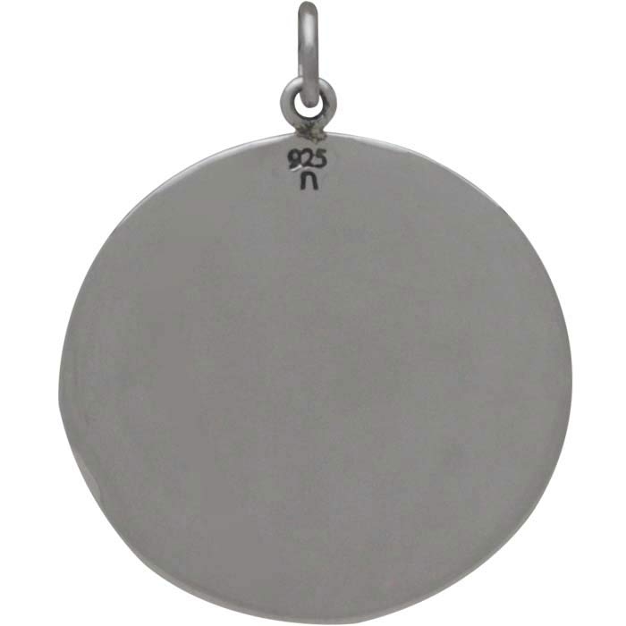 This sterling silver mirror pendant with granulation features a real mirror at the center of the design, and silver dots along the edge of the darkened, oxidized frame. The overall effect is moody, dramatic, and stormy.