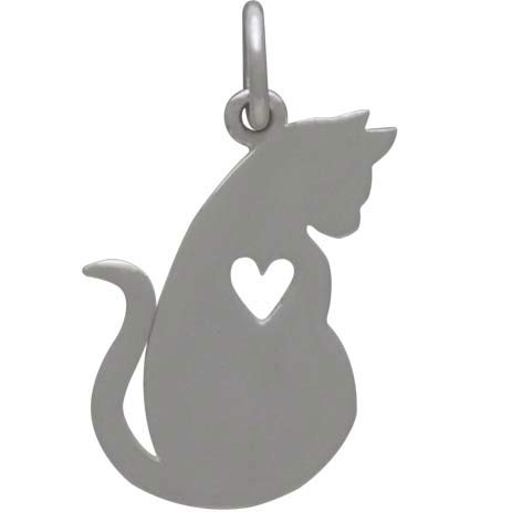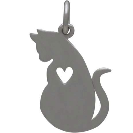 Sterling Silver Mommy Cat Charm with Heart Cutout. This silhouette of mommy cat sitting just-so with her tail curled and her eyes on her little kitty will melt your heart and send cat lovers to the moon. This mommy cat's perfectly plump shape, her attentive face, and her heart all say "I love you."