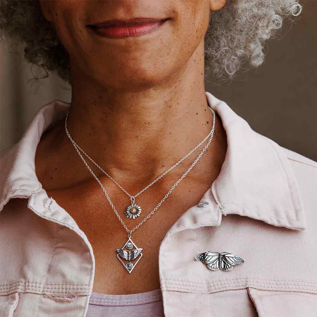 Wear this sterling silver monarch butterfly brooch to honor the queen of butterflies, symbolizing beauty, strength, endurance, trust and evolution. We marvel at her grace as she flutters by. understanding she's at the end of a miraculous migrational journey. We celebrate the monarch's arrival, and ponder how she's at her most beautiful later in life. This butterfly brooch delights with its gently curved wings, delicate texturing, and long antennae. It's a well sized brooch, not too big, not too small. Just right for most lapels, collars, jacket pockets, and scarves. Find more Brooches to add to your shop. (psst . . .. they're making a come back).